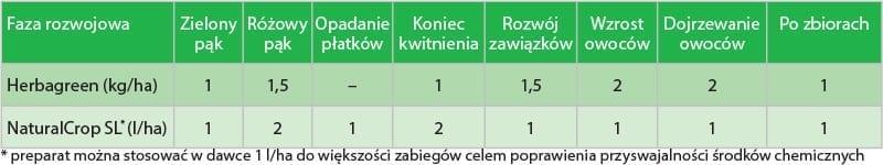 Podczas spotkania charakterystykę i zastosowanie nawozów Herbagreen oraz NaturalCrop SL przedstawił Dominik Poszywała (fot. 3), przedstawiciel firmy NaturalCrop Poland. Herbagreen to nawóz dolistny. Wytwarzany jest w zaawansowanej technologii turbinowej, zawiera makro- i mikroskładniki (w tym: tlenek wapnia, dwutlenek krzemu, trójtlenek żelaza, tlenek magnezu, dwutlenek tytanu, tlenek potasu, tlenek sodu, trójtlenek siarki, pięciotlenek fosforu, tlenek manganu, bor, miedź i cynk). Jest to mieszanina mineralnych koloidów nieprzetworzonych chemicznie. Podstawowym surowcem do produkcji tego nawozu są naturalne minerały (kalcyt) poddane opatentowanej technologii mikronizacji i elektrostatycznej aktywacji. Jak informował D. Poszywała, rośliny przyswajają zawarte w nawozie składniki o 20–40 razy efektywniej w porównaniu z nawozami sztucznymi. W roztworze nasyconym pH tego produktu wynosi 8–9,5. Ponadto zawarty w nawozie krzem korzystnie wpływa na wzmocnienie struktury komórkowej roślin. W wyniku tego tkanka rośliny jest mniej podatna na porażenie sprawcami chorób i zasiedlanie przez szkodniki. Dodatkowo – jak informował przedstawiciel firmy NaturalCrop – Herbagreen podnosi intensywność fotosyntezy, stabilizuje pH soku komórkowego, poprawia gospodarkę wodną roślin, skutecznie i szybko uzupełnia niedobory pierwiastków oraz podwyższa zawartość przeciwutleniaczy. Warto więc stosować go w celu odżywienia roślin wapniem i danymi mikroelementami, a także zwiększenia pobierania przez nie NPK. Nawóz ten wspomaga też regenerację roślin po wystąpieniu stresu (m.in. poparzenia herbicydowe, przemarznięcia, gradobicie, susza, zalanie). Natomiast w przypadku jabłoni łatwo przyswajalny wapń ogranicza wystąpienie gorzkiej plamistości podskórnej i skorkowacenia miąższu. Wpływa też korzystnie na wydłużenie trwałości owoców po zbiorze. Warto zwrócić uwagę, że nawóz ten jest dopuszczony do użycia w rolnictwie ekologicznym. W uprawie jabłoni i gruszy należy stosować go 5–7 razy (tab. 1).