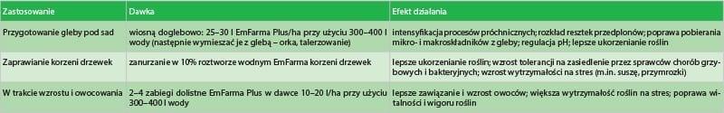 Należy jednak pamiętać, że wszelkie zabiegi z użyciem pożytecznych mikroorganizmów wymagają też specyficznych warunków. Najlepiej zabiegi nimi wykonywać przy wilgotnej aurze, zachmurzeniu i na wilgotną glebę – podkreślał A. Kartus. Nie należy stosować ProBio Emów łącznie ze środkami chemicznymi. Zabieg nimi należy wykonać dopiero po upłynięciu karencji danego środka chemicznego. Dlatego mikroorganizmy warto wprowadzać wtedy, kiedy nie możemy użyć lub możemy ograniczyć użycie środków chemicznych, np. w czasie długotrwałych mżawek, wczesną wiosną, tuż przed zbiorem owoców, późną jesienią. Jak informował A. Kartus, niektórzy sadownicy przekonali się już o korzyściach ze stosowania ProBio Emów tuż przed zbiorem owoców. Znajdująca się bowiem na powierzchni owoców pożyteczna mikroflora chroni je przed mikroflorą chorobotwórczą. Organizmy te są również stosowane w niektórych sortowniach z wodnym rozładunkiem. Po dodaniu ich do wody nie trzeba jej tak często wymieniać, eliminują pleśnie, a zasiedlone nimi jabłka lepiej znoszą transport i pobyt na półkach sklepowych. Warto stosować je także podczas przygotowania gleby pod nowe nasadzenie, w trakcie sadzenia drzew oraz w czasie ich wzrostu (tab. 2).