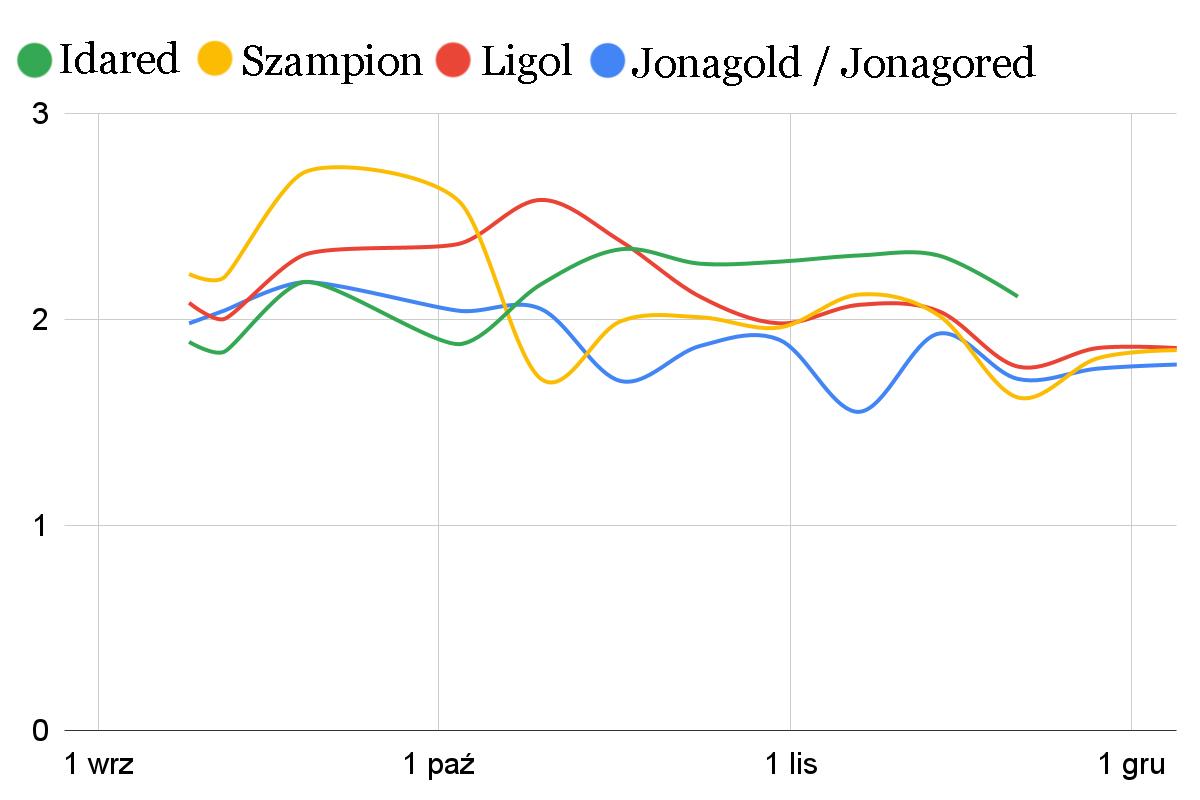 W przypadku pozostałych odmian ogólnie widzimy trend spadkowy w miarę trwania sezonu. Ponadto od połowy listopada ceny przykładowych odmian są bardzo wyrównane. Wcześniej były bardziej zróżnicowane. Może to wynikać z oferty jabłek z ubiegłego sezonu, która to była nieco droższa z powodu wyższych kosztów przechowania.