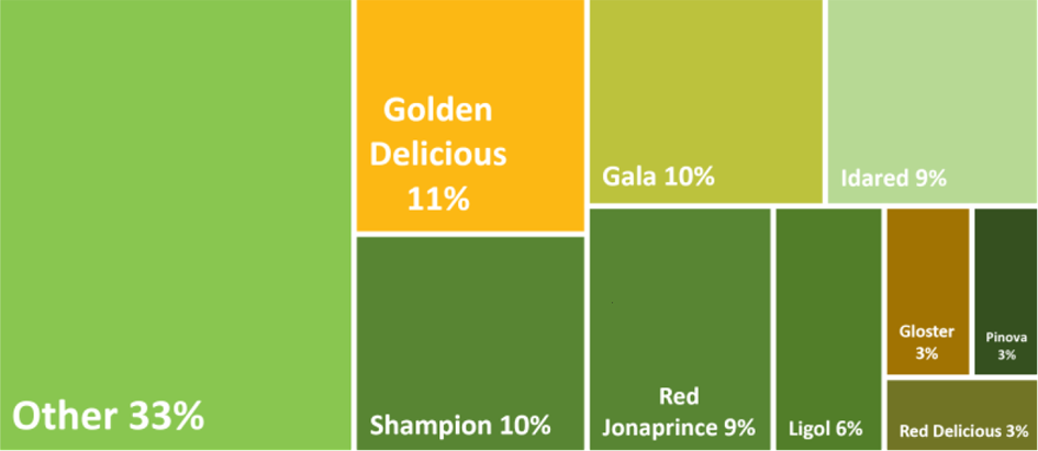 Oczywiście, można strukturę odmianową odnosić także do wyników jakie prezentuje corocznie WAPA – jednak obraz ten jest zaburzony ze względu na wprowadzenie kategorii „inne” (ang. Other), która obejmuje ponad 33% wyprodukowanych w Polsce jabłek. Tak wygląda to graficznie bazując na oficjalnym raporcie WAPA. W roku 2023 według tych danych przy zbiorach na poziomie 3,995 miliona ton odmiana numer jeden w Polsce był Golden Delicious: