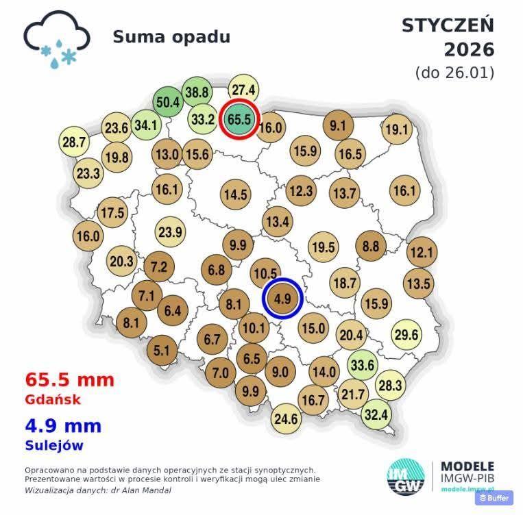 Patrząc na prognozy pogody, nie widać żadnych większych opadów, przynajmniej na ten moment. Jeśli w lutym solidnie nie popada, to wiosną będziemy mieli do czynienia z niedoborem opadów i suszą. Sumy opadu za styczeń są poniżej normy. Według danych IMGW, średnia suma opadów na Mazowszu w styczniu (norma wieloletnia 1991–2020) wynosi zazwyczaj od około 22 mm do 31 mm. Przed nami sucha, mroźna aura, a na deszczową wiosnę jeszcze się nie zanosi…