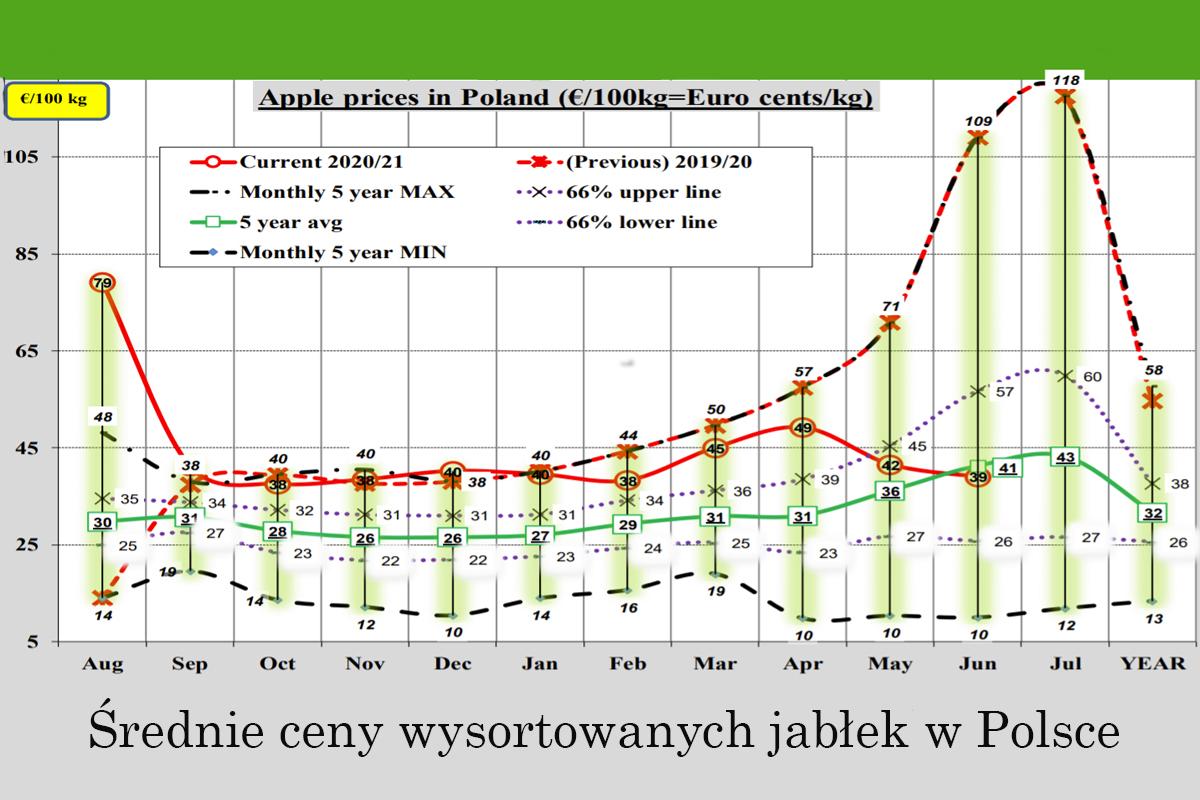 Polskie jabłka (wysortowane i zapakowane) średnio kosztowały w czerwcu 39 Euro za 100 kg (178 zł/100kg) Otrzymujemy zatem średnio stawkę 1,78 zł/kg wysortowanych jabłek przygotowanych do sprzedaży.