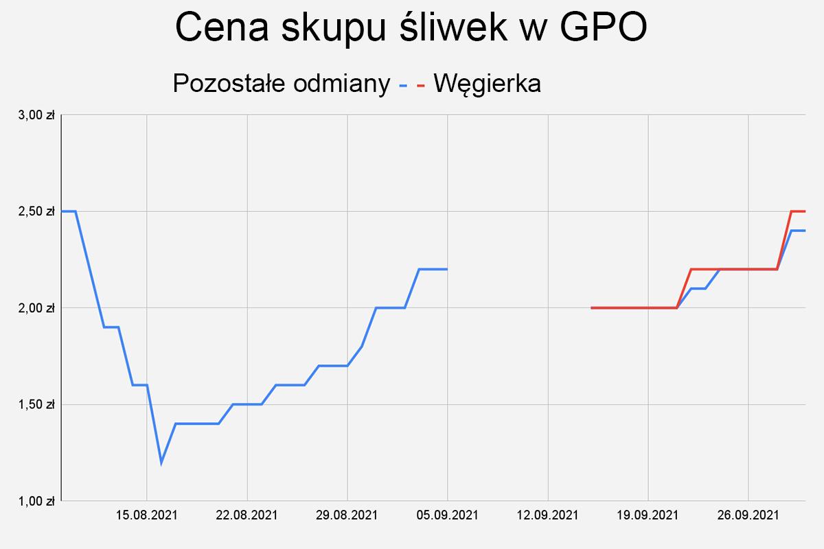 Obecnie za śliwki o średnicy powyżej 32 milimetrów sadownicy otrzymują w grupach producenckich najczęściej 2,40 zł za kilogram. W przypadku Węgierki cena wynosi 2,50 zł za kilogram. Z powodu specyfiki odmiany wymagania wielkościowe są mniejsze. Oferta dotyczy owoców powyżej 28 milimetrów. Średnia cena skupu od początku sierpnia wzrosła do 1,90 zł/kg.