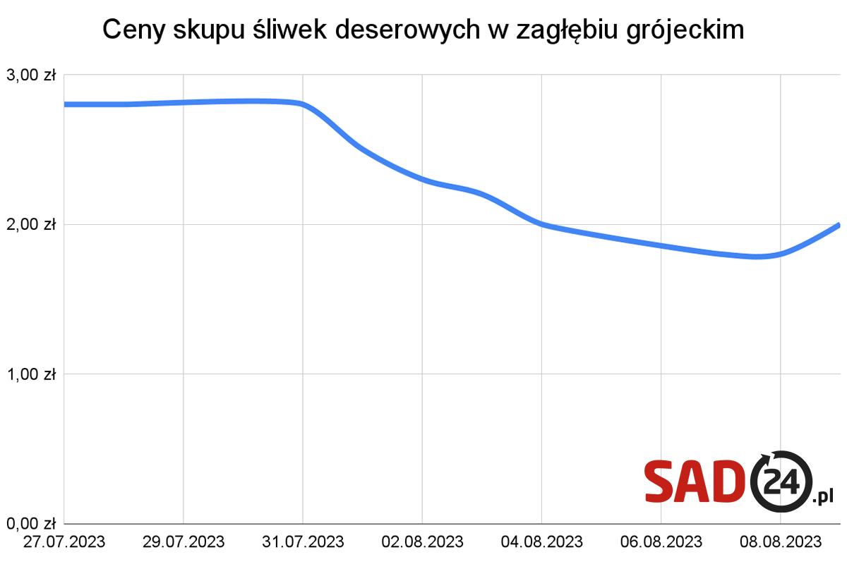 Na poniższym wykresie przedstawiliśmy ceny skupu śliwek w jednej z grup producenckich w zagłębiu grójeckim. W tym wypadku najniższa cena to 1,80 zł/kg. Jednak w tym samym czasie w rejonie były podmioty, które oferowały zaledwie 1,60 zł/kg. W okolicach Szydłowa ceny spadły do 1,50 zł/kg.