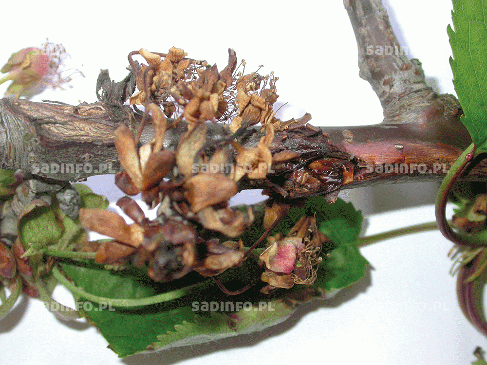 Część porażonych owoców opada i gnije pod drzewami, inne pozostają na nich, gdzie gnijąc, zasychając i ciemniejąc przekształcają się w pomarszczone, twarde mumie (fot. 6). Powinny być one usuwane, ponieważ stanowią źródło infekcji na przyszły sezon. Grzyby z rodzaju Monilinia, zwłaszcza M. laxa porażają także kwiaty, głównie moreli, śliwy, wiśni i czereśni, rzadziej brzoskwini. Z zakażonych kwiatów grzyb przerasta do pędów, powodując ich zamieranie (fot. 7). W Polsce znane były tylko dwa gatunki grzybów z rodzaju Monilinia. Nowe zagrożenie stanowią, notowane od niedawna w naszym kraju, dwa inne gatunki M. fructicola i M. polystroma. Pierwszy z nich ma status organizmu kwarantannowego we wszystkich krajach Unii Europejskiej. Nowe gatunki grzybów rozprzestrzeniają się prawdopodobnie wraz z importowanym materiałem szkółkarskim lub ze świeżymi owocami i mogą stanowić poważne zagrożenie dla rodzimych gatunków drzew owocowych.