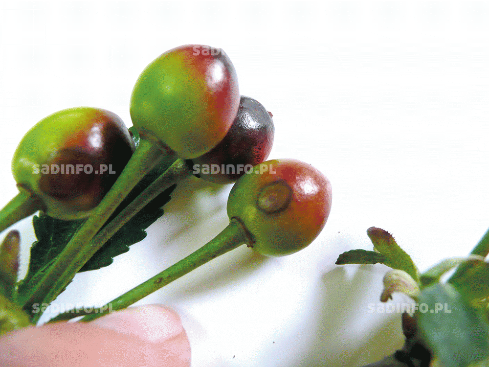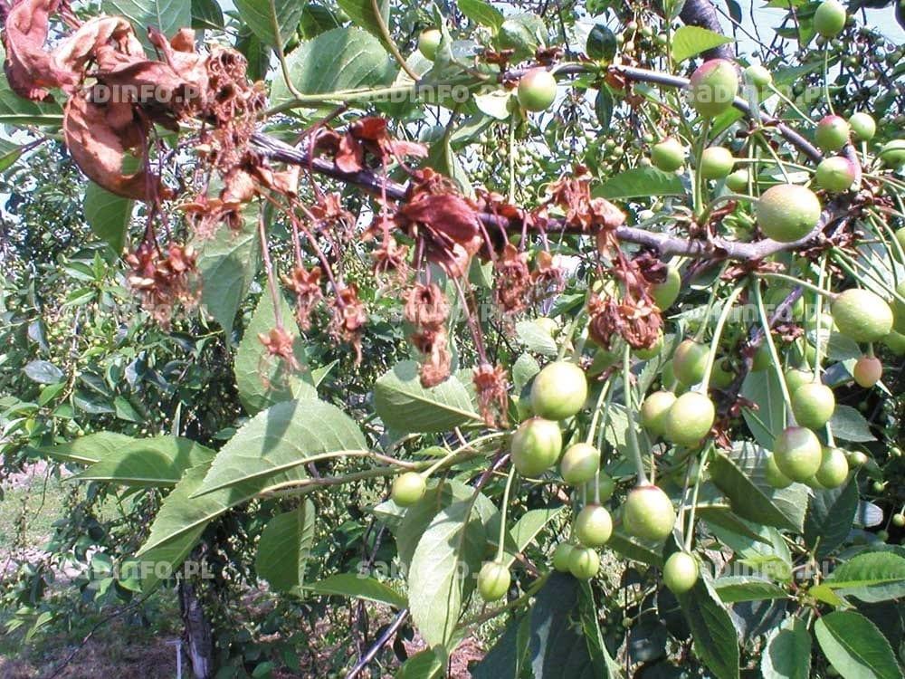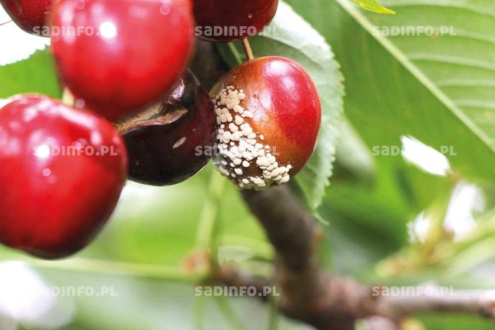 Warunki atmosferyczne wiosną i latem decydują także o nasileniu gorzkiej zgnilizny wiśni. Do masowego gnicia owoców przyczynia się zwłaszcza ciepła i wilgotna pogoda w czerwcu i lipcu. Porażeniu ulegają owoce w różnym stadium ich rozwoju, ale najwrażliwsze są te w fazie dojrzewania (fot. 10). Na owocach powstają gnilne, zapadające się plamy, na których w okresie wilgotnej pogody pojawiają się pomarańczowo-kremowe skupienia zarodników konidialnych będących źródłem kolejnych infekcji. Porażone owoce najczęściej zasychają i pozostają na drzewie w postaci mumii stanowiąc źródło infekcji w następnym sezonie. Choroba może mieć także przebieg utajony, bez objawów widocznych w sadzie, a ujawniających się dopiero podczas transportu i przechowywania owoców. Objawy tej choroby obserwowane są zwłaszcza na odmianach: ‘Northstar’, ‘Pandy’, ‘Groniasta z Ujfehertoi’, ‘Łutówka’, ‘Nefris’ i ‘Kelleris’. W sadach, w których choroba w poprzednim roku wystąpiła w dużym nasileniu, konieczna będzie intensywna ochrona w następnym sezonie. W celu ochrony owoców wskazane jest wykonanie 3 lub 4 opryskiwań co 10–14 dni, począwszy od 2 lub 3 tygodnia po kwitnieniu. Najskuteczniejsze w zapobieganiu chorobie są fungicydy zawierające kaptan lub tiuram. Nieznaczne ograniczenie choroby daje także fungicyd Score 250 EC, polecany do zwalczania drobnej plamistość liści drzew pestkowych. Jednak przy dużym nasileniu gorzkiej zgnilizny jego skuteczność może być niewystarczająca. Bardzo często o powodzeniu ochrony wiśni przed gorzką zgnilizną decyduje ostatni zabieg przed zbiorem owoców. Można go przeprowadzić nie później niż 7 dni przed zbiorem, gdyż tyle wynosi najkrótszy okres karencji dla niektórych środków zawierających kaptan lub tiuram (tylko Kaptan zaw. 50 WP, Kaptan Plus 71,5 WP i Sadoplon 75 WP). Natomiast w przypadku fungicydu Captan 80 WG i Merpan 80 WG okres karencji wynosi 21 dni, a w przypadku preparatu Merpan 480 SC – aż 28 dni.
