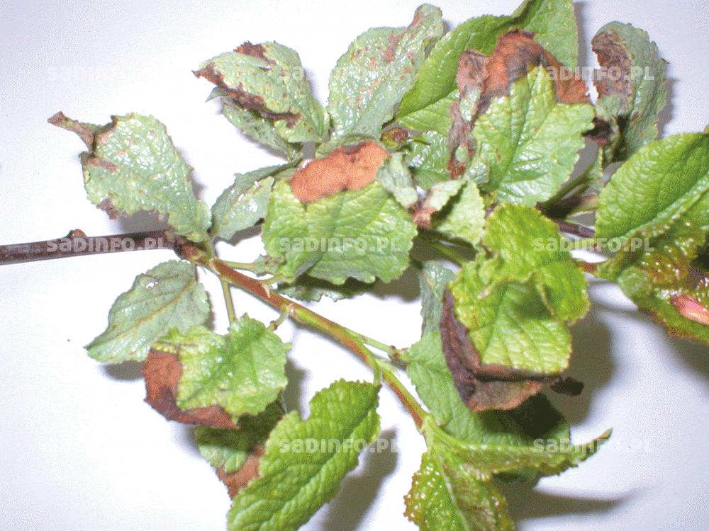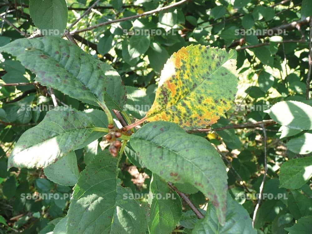 Chorobą, której objawy są corocznie obserwowane głównie na wiśniach i czereśniach, jest drobna plamistość liści drzew pestkowych (fot. 8). Jej nasilenie zależy od przebiegu warunków atmosferycznych od maja do końca sierpnia, a rozwojowi sprzyja duża ilość opadów po kwitnieniu. W niektóre lata znaczne nasilenie choroby widoczne jest dopiero po zbiorach owoców. Dochodzi wówczas do silnej defoliacji drzew (fot. 9) co istotnie obniża ich zdrowotność, plenność oraz wytrzymałość na przemarzanie. Zwalczanie drobnej plamistości liści drzew pestkowych polega przede wszystkim na chemicznej ochronie po kwitnieniu. Liczba zabiegów uzależniona jest od nasilenia źródła infekcji i przebiegu warunków pogodowych. Przy dużym zagrożeniu chorobowym należy wykonać nawet 4 zabiegi po kwitnieniu i jeden lub dwa po zbiorach. Do ochrony przed drobną plamistością polecane są przede wszystkim fungicydy dodynowe, a także Kaptan Plus 71,5 WP, Score 250 EC oraz Topsin M 500 SC. W niektórych sadach mogą jednak występować formy grzyba odporne na preparaty dodynowe lub tiofanat metylu (składnik czynny fungicydu Topsin M 500 SC), czego objawem jest spadek skuteczności wykonywanych nimi zabiegów. W takich przypadkach należy całkowicie zaprzestać ich używania, a ochronę oprzeć na preparatach należących do innych grup chemicznych, stosując (o ile to możliwe) rotację fungicydów.