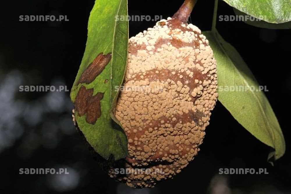 Nasilenie brunatnej zgnilizny drzew pestkowych zależy od poziomu źródła infekcji w danym sadzie i przebiegu warunków atmosferycznych, zwłaszcza w okresie kwitnienia drzew oraz wybarwiania się owoców. Źródłem infekcji mogą być porażone w poprzednim roku pędy lub owoce. Sprawcami choroby są grzyby z rodzaju Monilinia. Owoce poraża najczęściej grzyb M. fructigena, a do infekcji dochodzi poprzez różnego rodzaju pęknięcia skórki, najczęściej w okresach wilgotnej i ciepłej pogody. Na porażonych owocach powstają brunatne, gwałtownie powiększające się plamy gnilne, na których po pewnym czasie pojawiają się liczne, popielatoszare, nieregularnie ułożone brodawki – sporodochia grzyba (fot. 5).