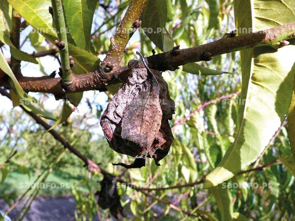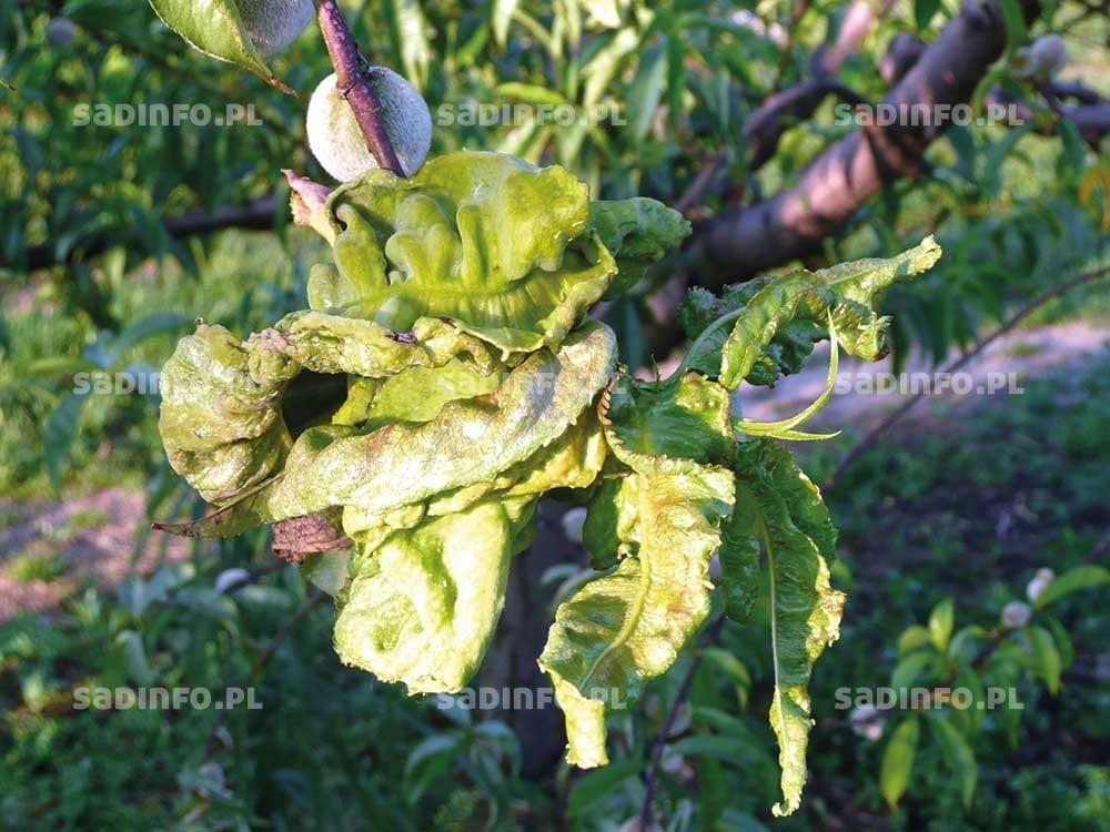Głównym problemem nękającym brzoskwinie i nektaryny jest kędzierzawość liści brzoskwini (fot. 11). Choroba ta występuje corocznie i powodowana jest przez grzyb Taphrina deformans. Nasilenie choroby zależy od przebiegu warunków atmosferycznych zimą i wczesną wiosną. Ciepłe zimy sprzyjają namnażaniu się zarodników grzyba, co zwiększa zagrożenie w okresie wiosennym. Czynnikiem sprzyjającym silnym infekcjom jest ponadto mokra i chłodna wiosna, która wpływa na przedłużenie rozwoju pąków i jednocześnie stwarza doskonałe warunki do zakażeń. Aby zapobiec porażeniu drzew przez tego patogena konieczna jest więc coroczna ochrona chemiczna. W sadach, w których w poprzednim sezonie choroba występowała w dużym nasileniu, a nie wykonano zabiegu w okresie jesiennym, tuż po opadnięciu liści, szczególnie ważny jest oprysk w okresie zimowych ociepleń, jeszcze przed ruszeniem wegetacji. W tym terminie polecane są zwłaszcza fungicydy miedziowe w stężeniu 1%. Zabiegi te ograniczają potencjał zakażenia drzew i wystąpienia choroby na wiosnę oraz zabezpieczają rośliny przed rakiem bakteryjnym. Natomiast zasadnicze zwalczanie choroby fungicydami dodynowymi lub tiuramowymi należy przeprowadzić wczesną wiosną w momencie nabrzmiewania pąków kwiatowych. Ochrona przed kędzierzawością liści brzoskwini może być skuteczna pod warunkiem, że będzie przeprowadzona dokładnie i w odpowiednim terminie. W niektóre lata wystarczy jeden zabieg, ale wykonany nie później niż przed pękaniem pąków. Ponadto, aby ochrona była skuteczna, woda używana do oprysku nie może być zbyt zimna, a temperatura powietrza powinna wynosić powyżej 6°C. Bardzo ważne jest też dokładne pokrycie drzew cieczą użytkową. W sadach z w pełni uformowaną koroną konieczne jest zużycie około 1000–1500 l wody na 1 ha.