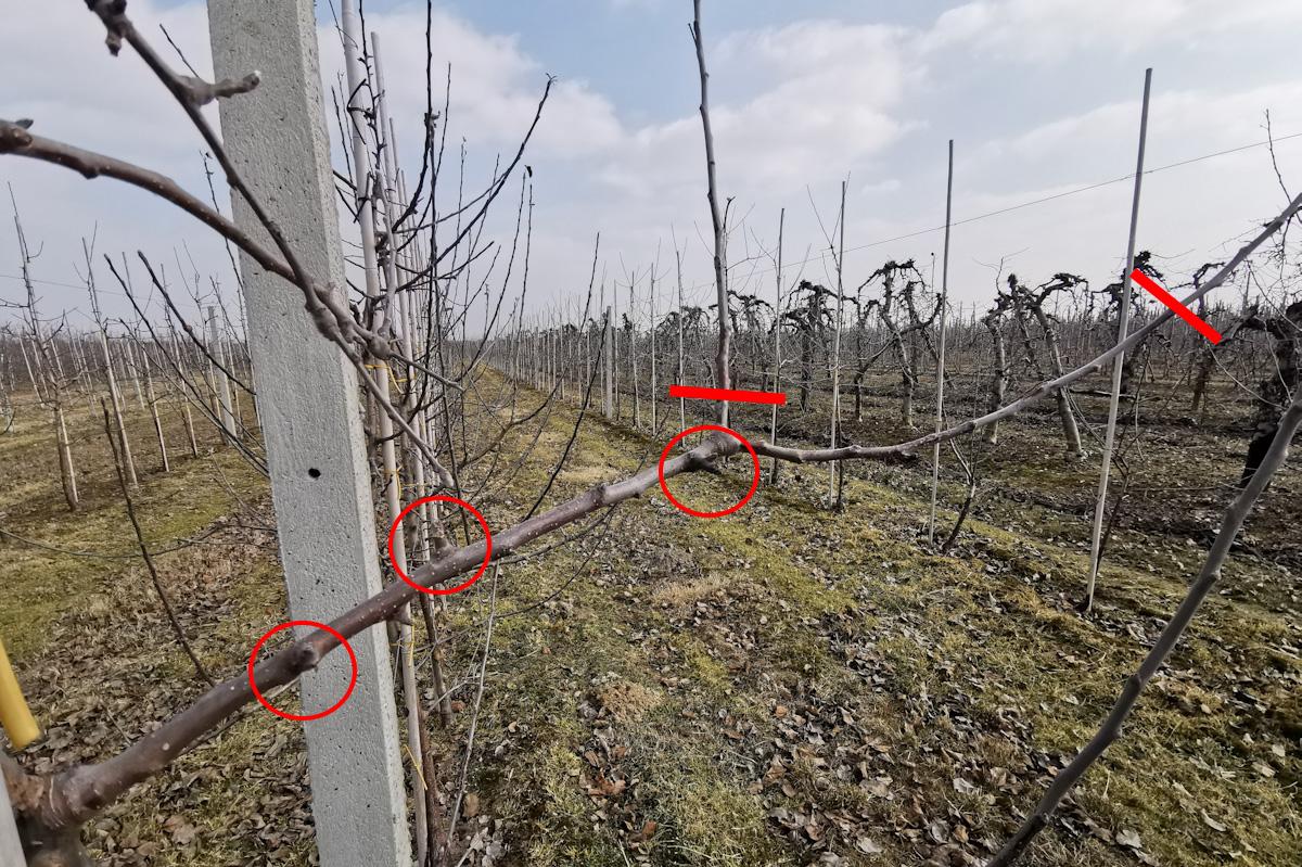 Wiele gałęzi powyżej linii "stołu" odchodzi od pnia pod ostrym katem. Należy je usuwać pozostawiając czopy. Jeśli natomiast gałąź wyrasta pod kątem zbliżonym do prostego wówczas zachowuje się wzorowo. Jak widzimy na zdjęciu niżej, w ubiegłym roku zgodnie z zasadami cięcia na "na klik" usunięto koniec jednorocznego przyrostu. W efekcie na dwuletnim drewnie mamy kilka pąków kwiatowych. Z jego zakończenia wyrosły dwa pędy, z których ten skierowany pionowo usuwamy, a ten będący przedłużeniem gałęzi skracamy. Cała gałąź pod ciężarem jabłek się obniży, a na pozostawionej części jednorocznego drewna pojawią się pąki kwiatowe.