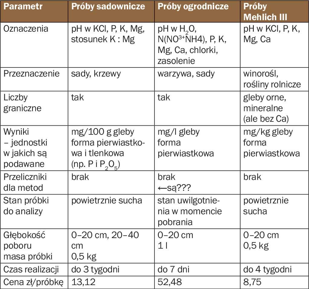 Obecnie w laboratoriach gleba jest badana metodą prób sadowniczych i ogrodniczych. Stosunkowo nowa jest natomiast metoda Mehlich III, która umożliwia zbadanie zawartości podstawowych składników (takich jak fosfor, potas, magnez, wapń) oraz pH. Problemem jest jednak to, że na razie próba Mehlich III ma zastosowanie tylko dla winorośli i roślin rolniczych – dla innych gatunków jak na razie nie opracowano bowiem liczb granicznych. Ponadto brakuje przeliczników pomiędzy wynikami poszczególnych metod. Są wprawdzie pewne współczynniki, które pozwalają przeliczyć próby ogrodnicze na sadownicze, ale obarczone są one błędem. Istotny jest też stan, w jakim próbka przekazywana jest do analizy (sucha, wilgotna). Próbka sadownicza musi być wysuszona, stad dłużej trzeba czekać na uzyskanie wyniku, natomiast ogrodnicza badana jest przy uwilgotnieniu, w jakim została dostarczona.