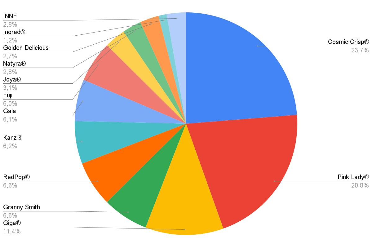 Jaka odmiana dominuje? Cosmic Crisp. Amerykańska odmiana, która sukces zawdzięcza ogromnym nakładom finansowym na reklamę i marketing stanowi dziś niemal jedną czwartą nowych nasadzeń w Południowym Tyrolu. Razem z Pink Lady stanowią niemal połowę nowozakładanych sadów.