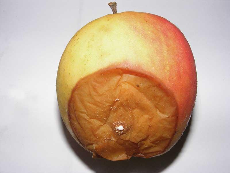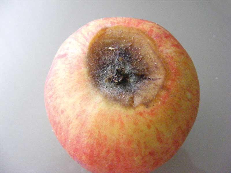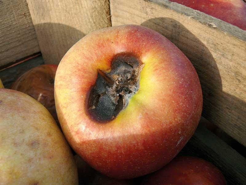Ostatnimi laty wiele problemów sprawiała zgnilizna gniazda nasiennego wywoływana przez grzyby z rodzaju Alternaria i Fusarium atakujące odmiany z głębokim zagłębieniem kielichowym np. ‘Gloster’, ‘Golden Delicious’, ‘Boskoop’. Pierwsze objawy choroby to ciemniejące łuski gniazda nasiennego pokrywające się szarą lub różowawą grzybnią, która z kolei stopniowo przerasta miąższ powodując jego ciemnienie i gnicie, choć z zewnątrz owocu nie widać żadnych objawów. Powyższe grzyby mogą rozwijać się w glebie, w przechowalni lub na pędach drzew i w sprzyjających warunkach infekować owoce. Alternaria i Fusarium, Botrytis cinerea (szara pleśń) oraz Sclerotinia, grzyb wywołujący zgniliznę twardzikową, mogą wywoływać też suchą zgniliznę przykielichową jabłek (fot. 3) – niewielkie, suche, brązowiejące plamy wokół szypułki w drugiej połowie lata, ale do zakażenia dochodzi wokół działek kielicha.