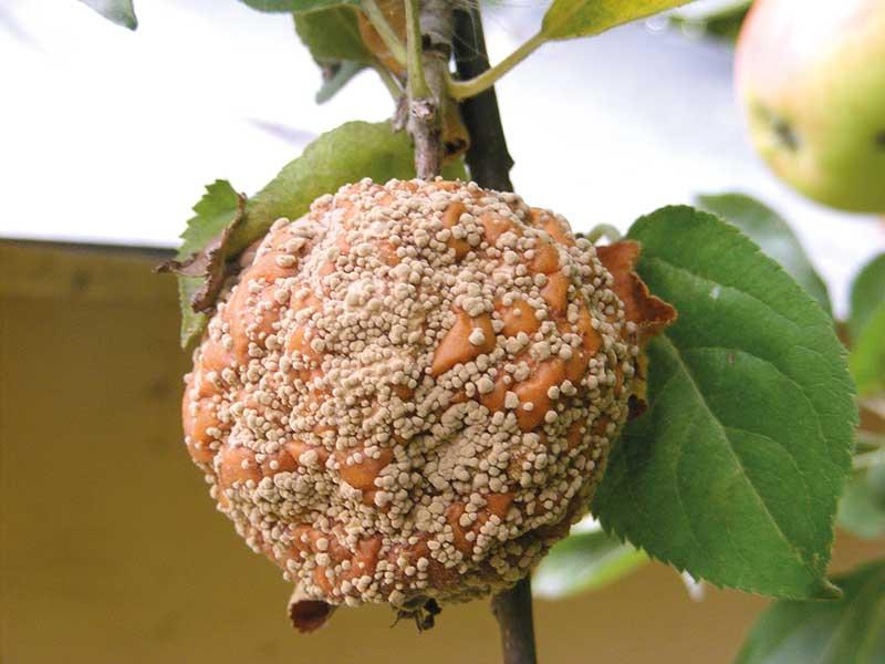 Innymi patogenami infekującymi kwiaty podczas deszczowej pogody są grzyby odpowiedzialne za brunatną zgniliznę drzew ziarnkowych: Monilinia fructigena, M. laxa i M. fructicola. Dwa ostatnie porażają drzewa także poprzez krótkopędy i pędy. Zainfekowane kwiaty brunatnieją, gniją i zamierają, na krótkopędach i pędach pojawiają się nekrotyczne plamy pokryte drobnymi, kulkowatymi skupieniami zarodników konidialnych. Charakterystycznie ułożone skupiska zarodników konidialnych pojawiają się także na powierzchni gnilnych plam na owocach (fot. 6). Owoce po wyschnięciu tworzą tzw. mumie mogące pozostać na drzewie nawet do następnego sezonu (fot. 7). Silnie porażone pędy mogą zamierać powyżej miejsca infekcji. Latem grzyby tworzą po kilka generacji konidiów, które zagrażają zarówno pędom, jak i owocom. Jednym z elementów profilaktyki, oprócz koniecznych zabiegów chemicznych, jest wycinanie chorych pędów, zbieranie mumii w sadzie i podczas przechowywania oraz ich niszczenie.