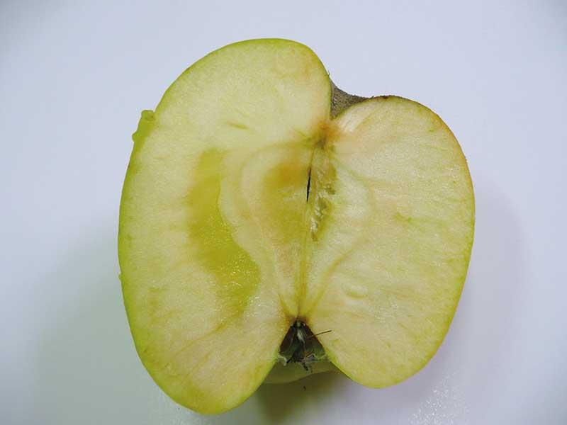 Różnica temperatury pomiędzy dniem i nocą, przy bardzo wysokiej w ciągu dnia, spowodowała wystąpienie na odmianach z grupy ‘Fuji’ szklistości miąższu (fot. 9) w szypułkowej części owocu, wystawionej na operację słoneczną. Pojawiły się tam wodniste, szkliste, liczne, małe plamki i rozmyte obszary. W obrębie zmian doszło do wysycenia przestworów międzykomórkowych sorbitolem, słodkim związkiem z grupy cukroli (alkohol rozpuszczalny w wodzie, transportowany z liści do owoców, gdzie przekształca się we fruktozę). Zaburzenia przemiany cukrów oraz zakłócenia w stosunkach wodnych (nadmierne uwodnienie komórek miąższu) powodują powstawanie takich zmian chorobowych na jabłkach. Podczas przechowywania szklistość sięga w głąb miąższu, aż do komór nasiennych lub jej objawy się cofają.