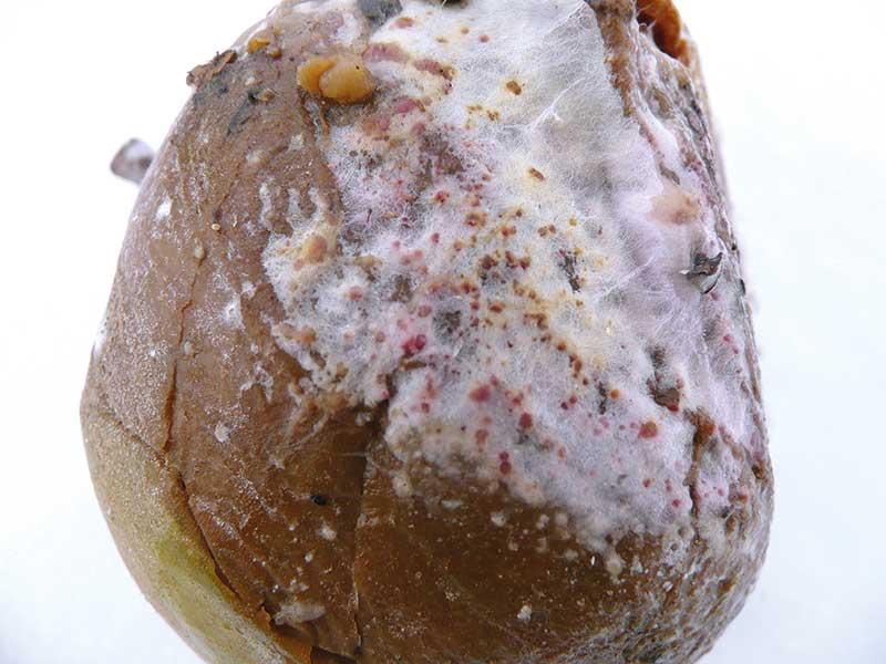 Gniciu jabłek podczas przechowywania sprzyjają nieodkażone i zanieczyszczone pojemniki, na których mogą bytować patogeny, np. saprofityczny Cladosporium herbarum, który w sprzyjających warunkach może powodować gnicie jabłek rozpoczynające się od niewielkich, brunatnych plam, w obrębie których tkanka ciemnieje i zapada się obejmując większą część owocu. Opakowania także często są zasiedlone przez grzyby Mucor piriformis lub Penicillium expansum, które – mimo iż są patogenami wtórnymi – wywołują zgniliznę jabłek. Kolejnym grzybem bytującym na opakowaniach jest Fusarium sp. Grzyb ten również powoduje gnicie jabłek, a objawem jego obecności są brunatne plamy pokryte białą, watowatą grzybnią z różowawymi skupieniami zarodników konidialnych (fot. 11).