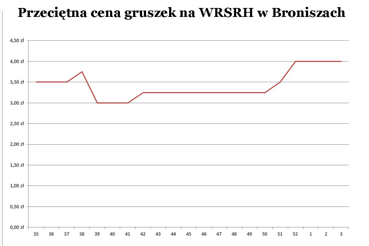 Zarówno w strukturze uprawy i sprzedaży dominuje w Polsce odmiana Konferencja. Poniższy wykres również dotyczy tej odmiany. Przedstawia przeciętne ceny na rynku hurtowym w Broniszach. Na osi poziomej tydzień roku, na osi pionowej cena.