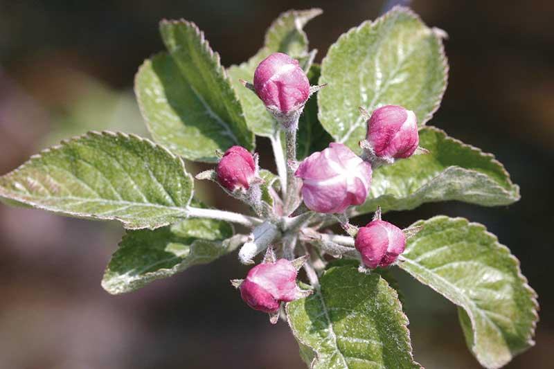 Zielony/różowy pąk. Pojawienie się liści rozetowych związane jest z gwałtownym zwiększaniem się masy zielonej. Głównymi składnikami pokarmowymi potrzebnymi do budowy biomasy są azot, żelazo i magnez. Prawidłowo wykształcone, o dużej zawartości chlorofilu liście są podstawą prawidłowego kwitnienia, zawiązywania i wzrostu owoców w późniejszym okresie. W okresie zielonego pąka (fot. 3) wskazane jest wykonanie dokarmiania dolistnego wieloskładnikowym nawozem o zrównoważonym składzie. Poprawia się w ten sposób zaopatrzenie drzew w azot, fosfor, potas oraz kondycję pierwszych liści. W warunkach złego zaopatrzenia drzew w magnez może okazać się konieczny niewielki dodatek nawozu magnezowego. W przypadku, odmian o jasnozielonych liściach rozetowych (’Šampion’, ‘Golden Delicious’, ‘Idared’ i ‘Pinova’) konieczne może być nawożenie żelazem. Zabieg nawozem zawierającym ten składnik wpływa na zwiększenie zawartości chlorofilu i zwiększenie tempa fotosyntezy. Zielony pąk to także czas na zastosowanie pierwszego opryskiwania borem, który bierze udział procesach kwitnienia i zapylenia – decyduje o żywotności ziaren pyłku, wzroście łagiewki pyłkowej, zawiązywaniu kwiatów. Przemieszczanie się tego pierwiastka w roślinie zachodzi zgodnie z kierunkiem transportu wody, czyli najlepiej zaopatrzone w bor są części rośliny intensywnie transpirujące – starsze w pełni rozwinięte liście. Stąd słabe zaopatrzenie tkanek merystematycznych nadziemnej części roślin. Zjawisko przemieszczania się boru w roślinach z organów starszych do młodszych i z części wegetatywnych do generatywnych jest stale przedmiotem dyskusji naukowców. Ostatnie opracowania wskazują na możliwość zachodzenia takich procesów a zwłaszcza przemieszczania boru do organów generatywnych w śliwach, jabłoniach i gruszach (za W. Grzebiszem). Niedostatki boru w najmłodszych częściach rośliny wynikają głównie z faktu zależności odżywienia tych organów od zaopatrzenia w bor pochodzący z gleby. Pobieraniu boru przez rośliny sprzyja/ogranicza wiele czynników. Większą zawartością tego składnika charakteryzują się gleby gliniaste oraz bogate w materię organiczną niż piaszczyste i ubogie w próchnicę. Optymalne pobieranie boru z gleby jest wówczas, gdy jej odczyn znajduje w zakresie 5,5–6,5. W glebach kwaśnych następuje zjawisko wymywania boru, natomiast w takich o pH powyżej 6,5 pobieranie tego mikroelementu przez rośliny jest utrudnione.