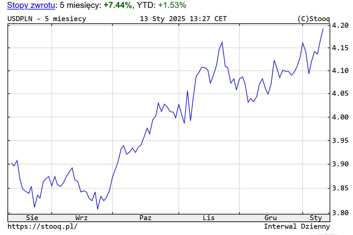 Nasza złotówka słabnie. Kurs dolara do złotego wzrósł prawie o 40 groszy w 4 miesiące, co doskonale widzimy na załączonej grafice. Dziś, czyli 13 stycznia, kurs „dotknął” 4,20 zł.