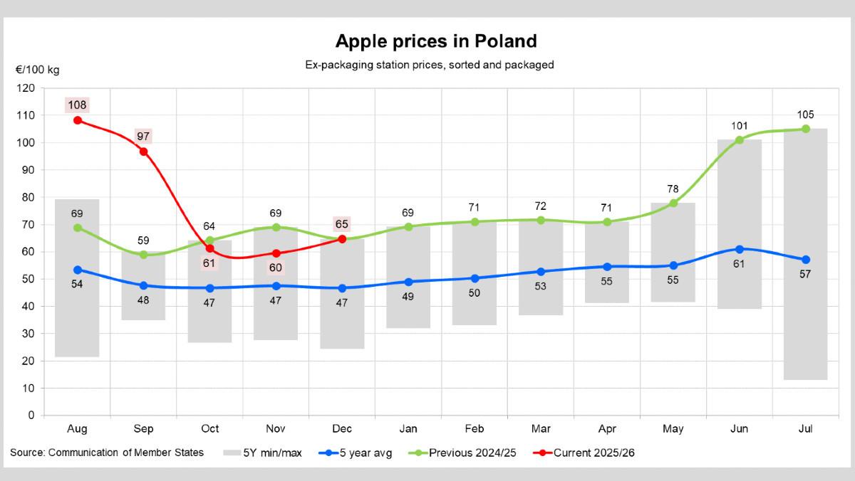 Podobnie można tłumaczyć spadające ceny w Niemczech. Niemcy nie mają nadwyżek jabłek i nie wysyłają ich do Indii czy krajów arabskich – praktycznie cała ich produkcja jest zagospodarowywana na rynku krajowym. Ponadto rok 2025 oznaczał wzrost produkcji o około 15%, do poziomu 1 miliona ton. W efekcie cena każdego kilograma była tam znacznie niższa niż w Polsce. W grudniu wynosiła zaledwie 2,06 zł/kg.