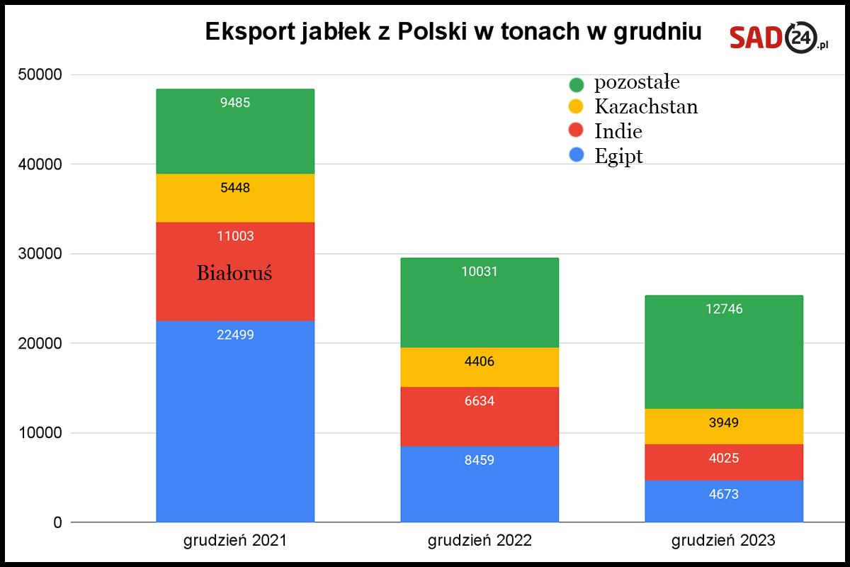 Poniżej przedstawiamy wykres eksportu jabłek w grudniu 2021-2023 z uwzględnieniem udziału trzech największych rynków. W 2021 roku drugim co do wielkości odbiorcą była Białoruś. Na przygotowanym wykresie widzimy wyraźnie, jak zmniejszał się udział Egiptu w grudniowym eksporcie.