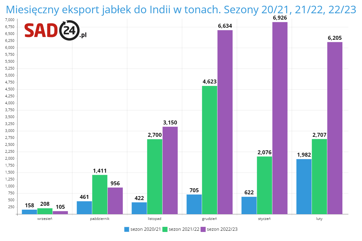 Jak widzimy na wykresie niżej, w trwającym sezonie osiągamy bardzo dobre wyniki eksportowe w porównaniu do dwóch poprzednich. Grudzień, styczeń i luty to wysyłki powyżej 6000 ton w miesiącu. Czyli w każdym z tych miesięcy wysłaliśmy do Indii więcej jabłek niż przez 6 miesięcy sezonu 2020/2021. Tak prezentował się eksport do Indii od września do lutego w trzech ostatnich sezonach: