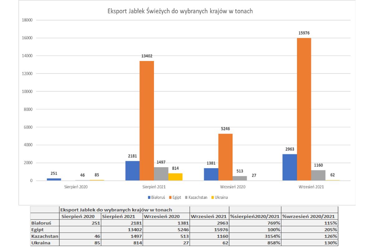 Dane PIORiN-u opracowane przez Związek Sadowników RP ukazują ogromny wzrost eksportu w stosunku rok do roku. W przypadku Białorusi wzrost pomiędzy sierpniem 2020, a sierpniem 2021 wynosi aż 769%, natomiast między wrześniem 2020 a wrześniem 2021 - 115%. Porównanie eksportu do Egiptu we wrześniu rok do roku pokazuje 200% wzrost eksportowanych ilości. Dane mówią jednoznacznie, że eksport jabłek z polski nie stoi, tylko wyraźnie rośnie!
