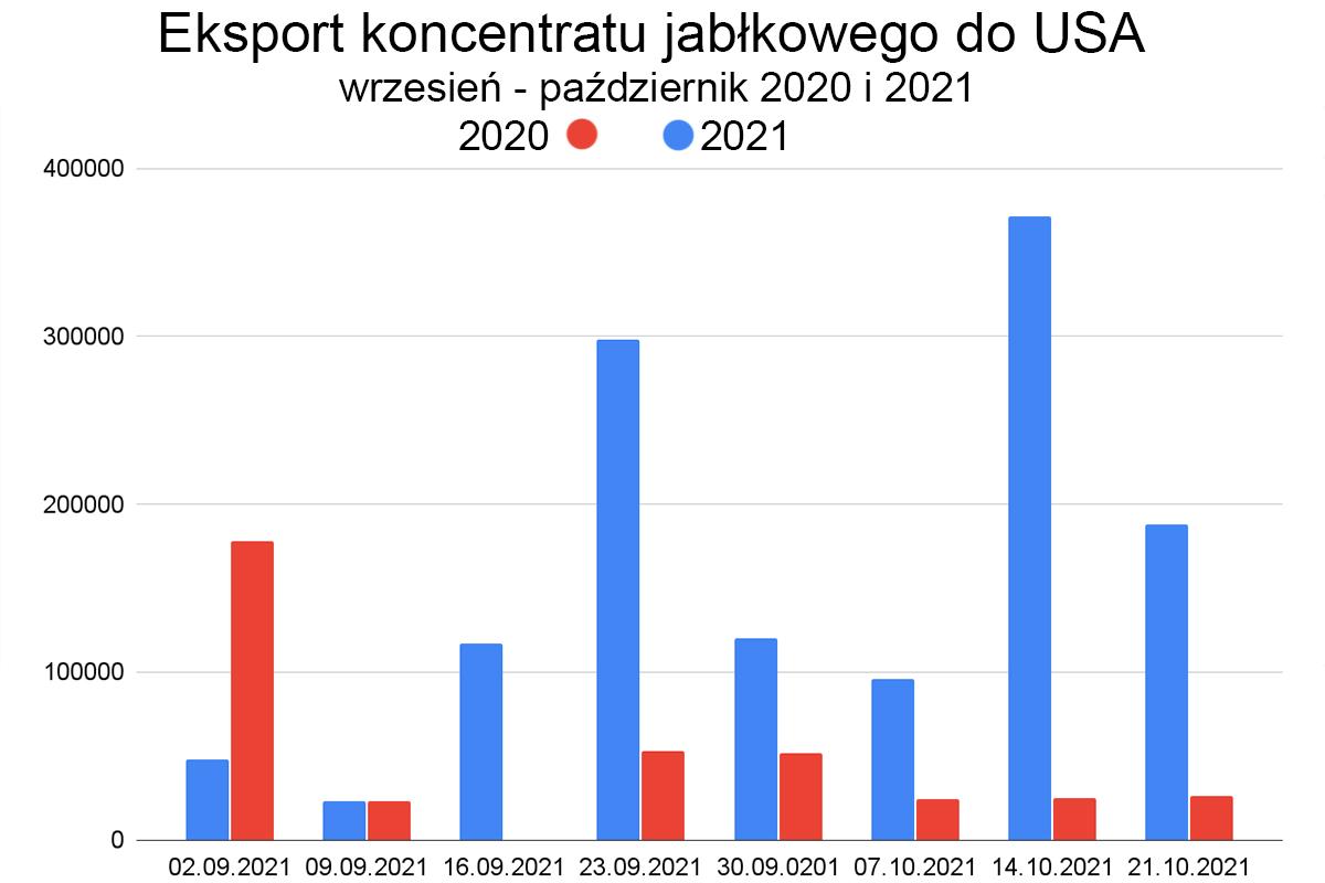 Sytuacja w międzynarodowym transporcie, a raczej komplikacje w nim sprawiają, że rośnie eksport koncentratu jabłkowego do Stanów Zjednoczonych. Od początku września do chwili obecnej przetwórnie działające na terenie Polski zanotowały 230%-owy wzrost eksportu w stosunku rok do roku.