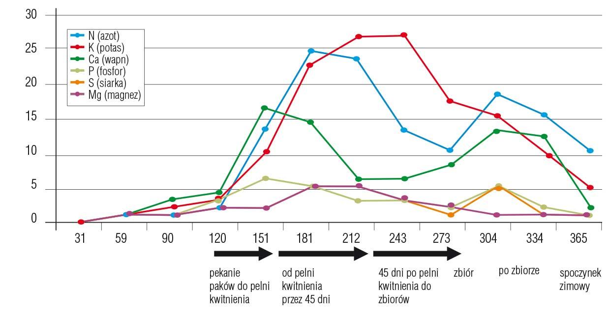 Cykl pobierania azotu jest ściśle związany z fazami fenologicznymi roślin. Zwykle drzewa owocowe zaczynają intensywnie pobierać azot około pełni kwitnienia. Do tego czasu korzystają z jego naturalnych zapasów, które zostały zgromadzone w poprzednim sezonie w ich tkankach (rysunek 1). Łatwo można to zauważyć wiosną po bardzo mroźnej zimie. W przypadku przemarznięcia systemu korzeniowego podkładki, wiosną najczęściej rozpoczyna się wegetacja, obserwuje się rozwój organów zielonych, a nawet kwiatów, jednak z czasem (zazwyczaj zaraz po kwitnieniu), kiedy zachodzi potrzeba już bardziej intensywnego odżywienia rośliny i pobierania wody oraz soli mineralnych z roztworu glebowego, uszkodzone przez mróz drzewa stopniowo zamierają.