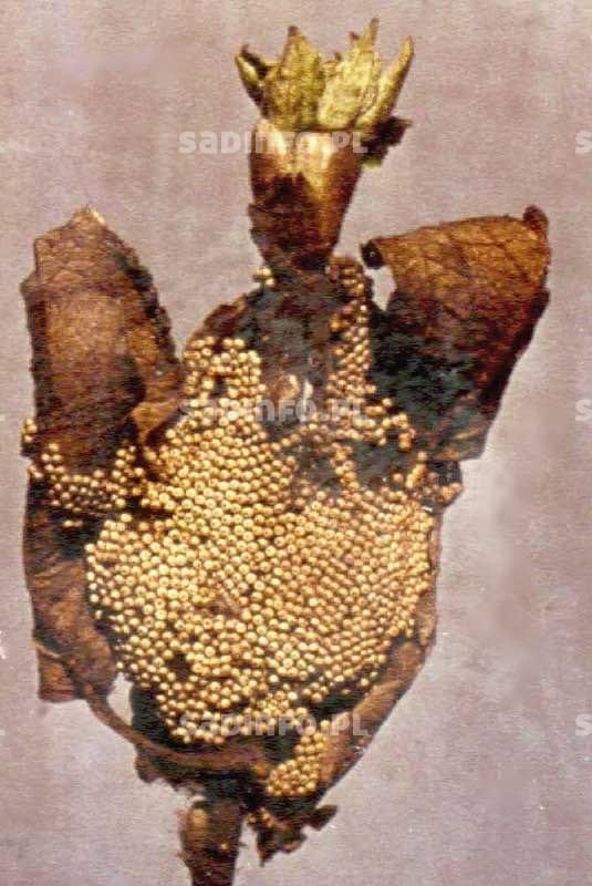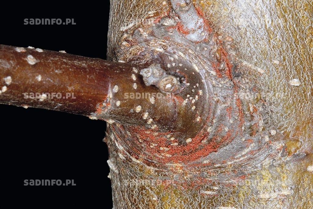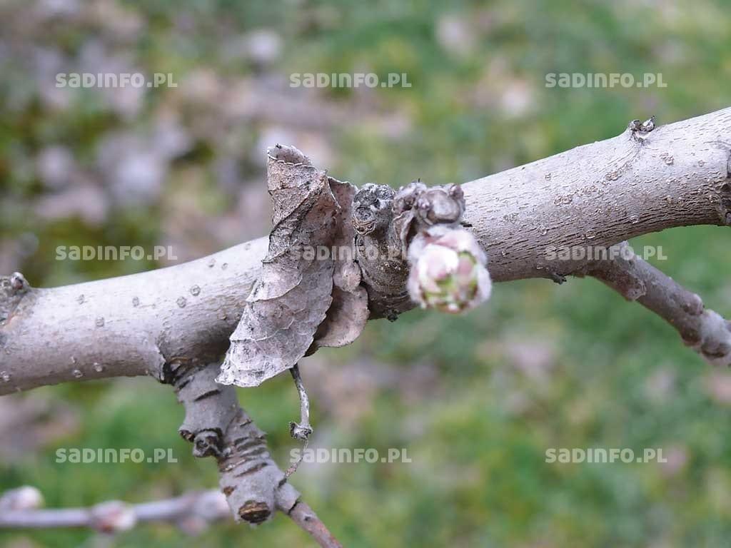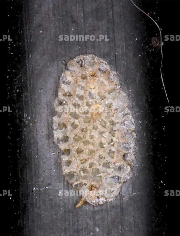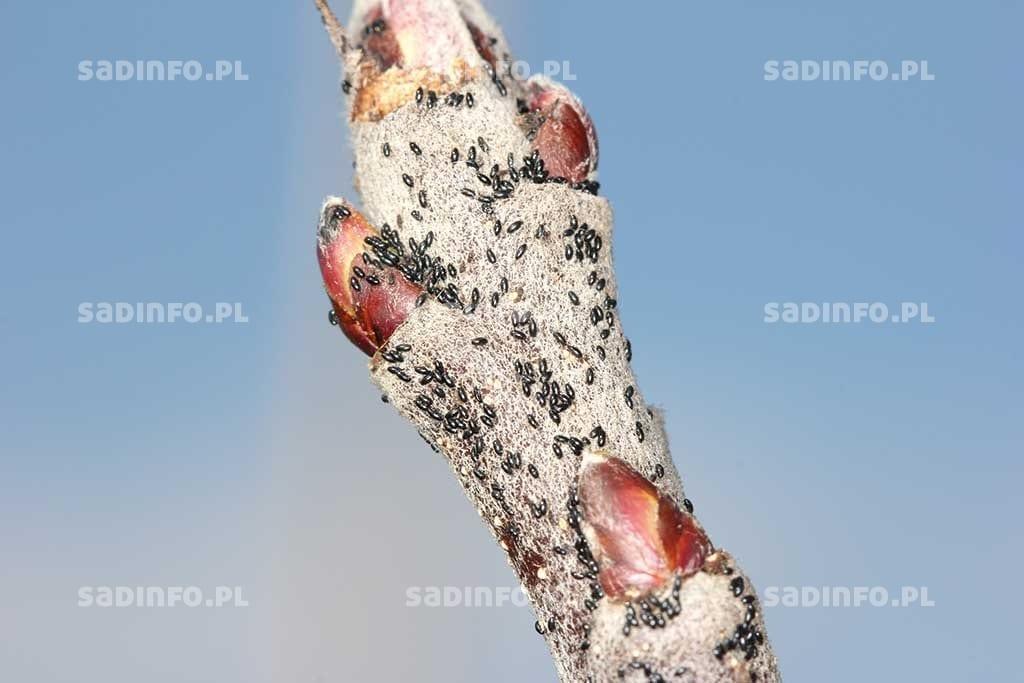 To jedne z najpowszechniejszych i najgroźniejszych szkodników roślin sadowniczych. Duże znaczenie ekonomiczne mają przede wszystkim dwa gatunki: przędziorek owocowiec i przędziorek chmielowiec. I choć szkodliwość ich jest podobna to biologia odmienna. Stadium zimującym przędziorka owocowca są charakterystyczne jaja składane na pędach (fot. 1) i konarach, a czasami także na pniach. Jaja zimowe są intensywnie czerwone, południkowo żeberkowane i pod dużym powiększeniem wyglądają jak miniaturowe cebulki, gdyż ich chorion przechodzi w części wierzchołkowej w dość długi nitkowaty wyrostek. Są składane najczęściej w złożach po kilkanaście, kilkadziesiąt, a nawet kilkaset. Miejsce ich złożenia znajduje się zazwyczaj na południowej stronie drzew i przeważnie na spodniej stronie pędów, z reguły w pobliżu pąków lub w fałdach kory na granicy przyrostów. Duże złoża, w okresie bezlistnym, szczególnie w dni słoneczne, są bardzo dobrze widoczne w postaci czerwonych nieregularnych plam różnej wielkości. Jaja zimowe przędziorka owocowca są bardzo odporne na niską temperaturę i giną dopiero, gdy spadnie ona poniżej –35°C. Lustracje na obecność i liczebność jaj zimowych na drzewach najlepiej przeprowadzać pod koniec okresu bezlistnego. Jeżeli na czterdziestu 2- i 3-letnich gałęziach przeglądniętych na losowo wybranych drzewach (po jednej na każdym drzewie) stwierdzi się więcej niż 80 złóż o średnicy większej niż 0,5 cm, to należy się liczyć z koniecznością wykonania zabiegu zwalczającego przed kwitnieniem. Gałęzie do analizy należy wybierać głównie od strony południowej.