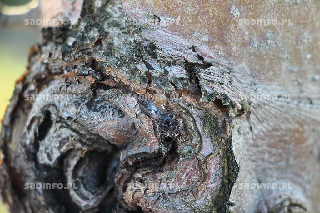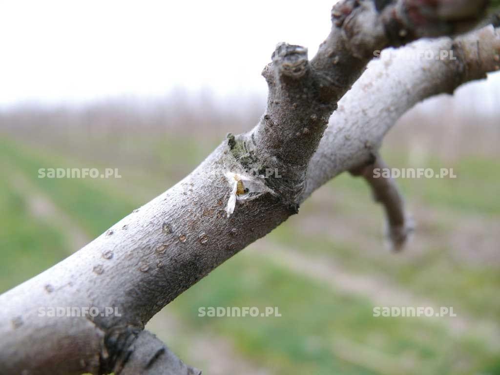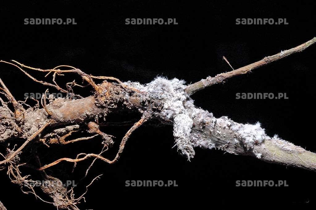 Szkodnikiem sadów jabłoniowych, którego ważność wzrosła w ostatnich kilkunastu latach jest bawełnica korówka (mszyca krwista). Formą zimującą tego gatunku są głównie młode larwy, które ukrywają się na zimę w różnych zakamarkach w koronie drzew (fot. 3). Wraz z obniżaniem się temperatury schodzą one na szyjkę korzeniową i na sąsiadujące z nią korzenie (fot. 4). Stadia te są również najbardziej odporne na niską temperaturę, wytrzymują jej spadki do –25°C. W trakcie łagodnych zim mogą przeżywać kolonie, w których znajdują się osobniki w różnym stadium rozwojowym, wraz z dorosłymi samicami. Istotnym abiotycznym czynnikiem redukującym populacje tego szkodnika jest niska i utrzymująca się przez dłuższy okres temperatura poniżej -20°C. Najważniejszymi natomiast czynnikami biologicznymi ograniczającymi ich populację są skorki i osiec korówkowy.