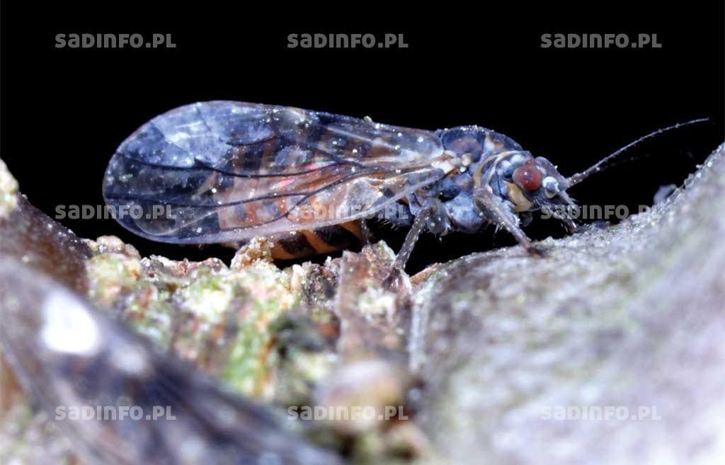 Na gruszach natomiast występują miodówki: gruszowa plamista, gruszowa czerwona i gruszowa żółta. Pierwsza ma najważniejsze znaczenie pod względem ekonomicznej szkodliwości. Zimującym stadium tego szkodnika są dorosłe samice formy zimowej – ciemniejsze niż samice pokoleń letnich (fot. 5). Zagrożenie ze strony miodówki gruszowej plamistej należy oceniać już w okresie bezlistnym, strząsając owady dorosłe na płachtę entomologiczną, a następnie, w przypadku kilkudniowego ocieplenia, przeglądając gałązki oraz pędy na obecność jaj szkodnika. Jeżeli w trakcie lustracji stwierdzone zostanie przekroczenie progu zagrożenia (patrz Program Ochrony Roślin Sadowniczych) to jest to sygnał do wykonania zabiegu zwalczającego nawet już w marcu (jeżeli sprzyjają warunki atmosferyczne). W regulacji liczebności miodówki gruszowej plamistej ogromną rolę (nie do przecenienia) odgrywają owady drapieżne (dziubałek gajowy, dziubałek leśny dziubałeczek mały, skorki, złotooki, biedronki), a w okresie jesiennym parazytoid (Sectiliclava cleone) dorosłych owadów miodówki.