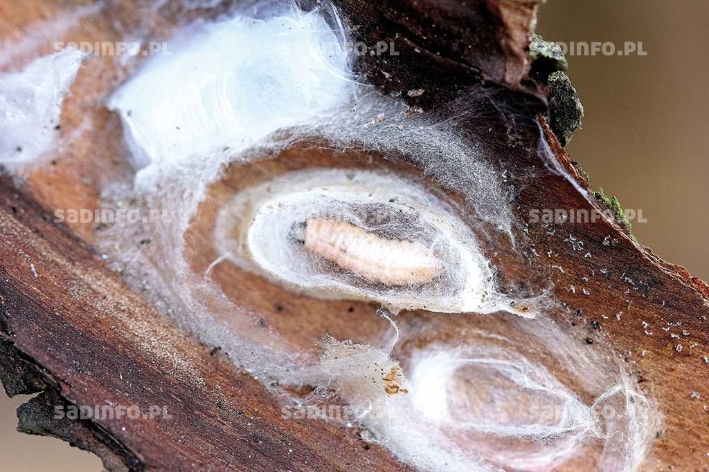 Owocówka jabłkóweczka i owocówka śliwkóweczka zimują w stadium larw w oprzędach zwanych często kolebkami (fot. 8). Oprzędy takie tworzone są najczęściej w różnych zakamarkach drzewa (spękania kory, odstająca kora po uszkodzeniach mechanicznych, inne szczeliny w korze), w drewnianych konstrukcjach podtrzymujących drzewo, czy nawet w skrzynkach i innych opakowaniach drewnianych składowanych na wolnym powietrzu. Czasami zdarza się, że zimują także w glebie. Zimowanie larw owocówek można łatwo obserwować, gdy założy się na pnie drzew opaski z papieru falistego – larwy chętnie tam właśnie się skryją. Istotną rolę w redukcji liczebności zimujących larw owocówek odgrywają ptaki owadożerne. W trakcie dokładnych obserwacji ustalono, że niszczą one od 70% do ponad 80% zimujących larw tych szkodników. W niektórych latach pewna część populacji niszczona jest przez entomopatogeniczne grzyby oraz przez niesprzyjające warunki atmosferyczne.