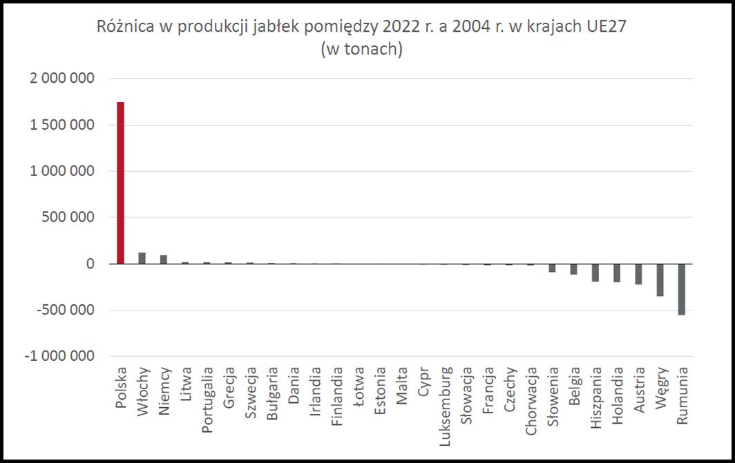 Analitycy Polskiego Funduszu Rozwoju porównali produkcję jabłek w 2004 i 2022 roku we wszystkich krajach UE. Jak widać wyróżniamy się w tym zestawieniu. Przez 18 lat nasza produkcja zwiększyła się o około 1,75 miliona ton! Przez ten okres nieco wzrosła również produkcja we Włoszech i Francji. Z kolei w większości krajów jest na stabilnym poziomie.