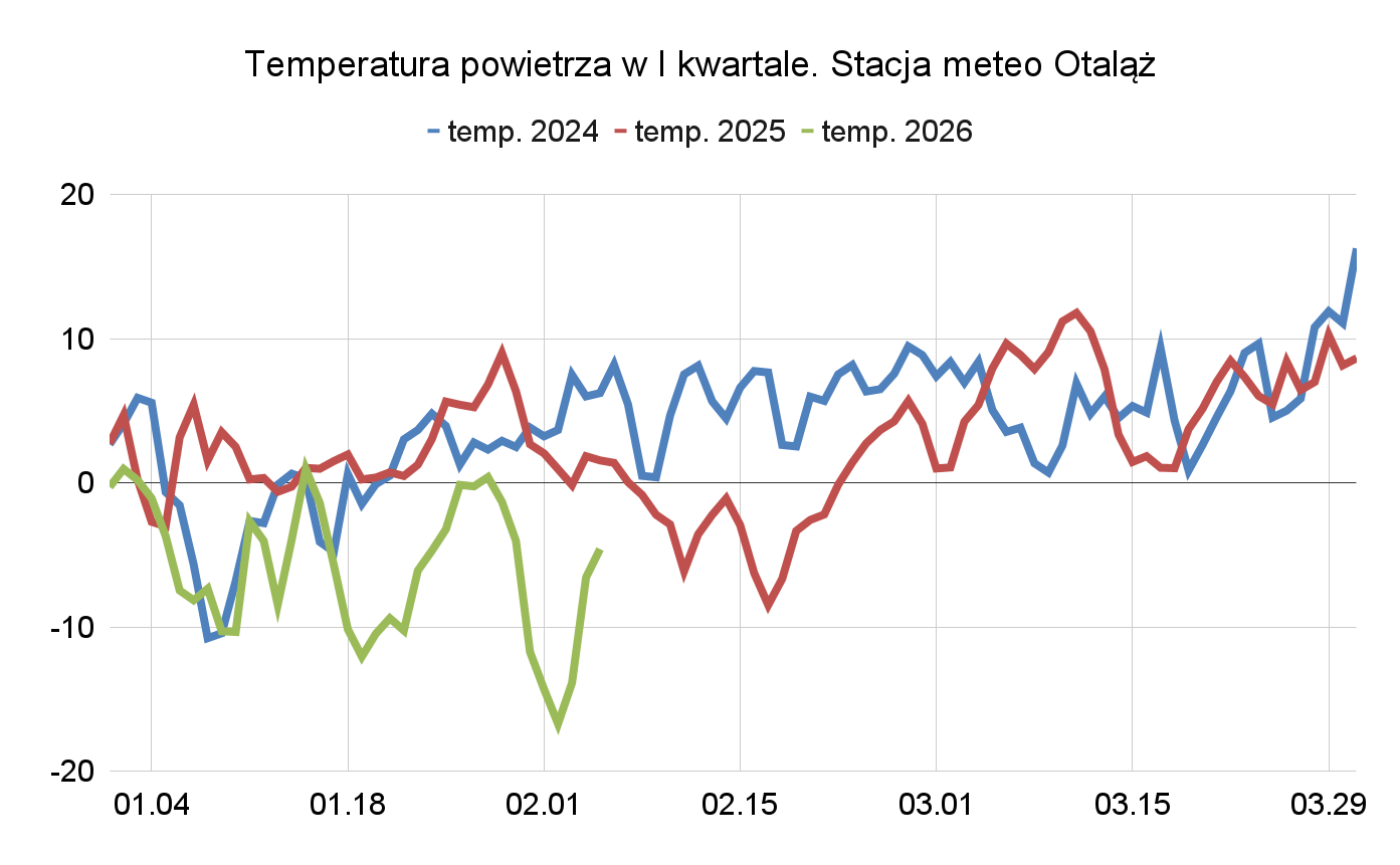Drugi wykres dotyczy temperatur powietrza. Również tutaj wyraźnie widać, jak ciepły był luty 2024 (niebieska linia) i jak niska jest temperatura w 2026 roku (zielona linia). W tym przypadku także prezentowana jest średnia dobowa.