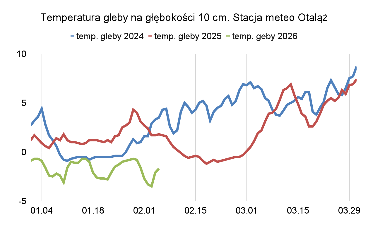W tym roku pisaliśmy już, że średnia temperatura w styczniu była znacznie niższa nie tylko od ubiegłorocznej, ale także od średniej wieloletniej. Dziś chcemy bardziej skupić się na temperaturze gleby i przygotowaliśmy wykresy prezentujące ten parametr w pierwszym kwartale 2024 i 2025 roku oraz od 1 stycznia do 5 lutego tego roku. Dane pokazują średnią dobową. Jak widać, różnice są duże. Szczególnie dobrze widoczna jest cieplejsza gleba w lutym 2024. Średnia temperatura gleby od początku roku do 5 lutego wynosi kolejno: