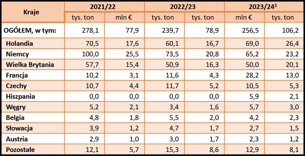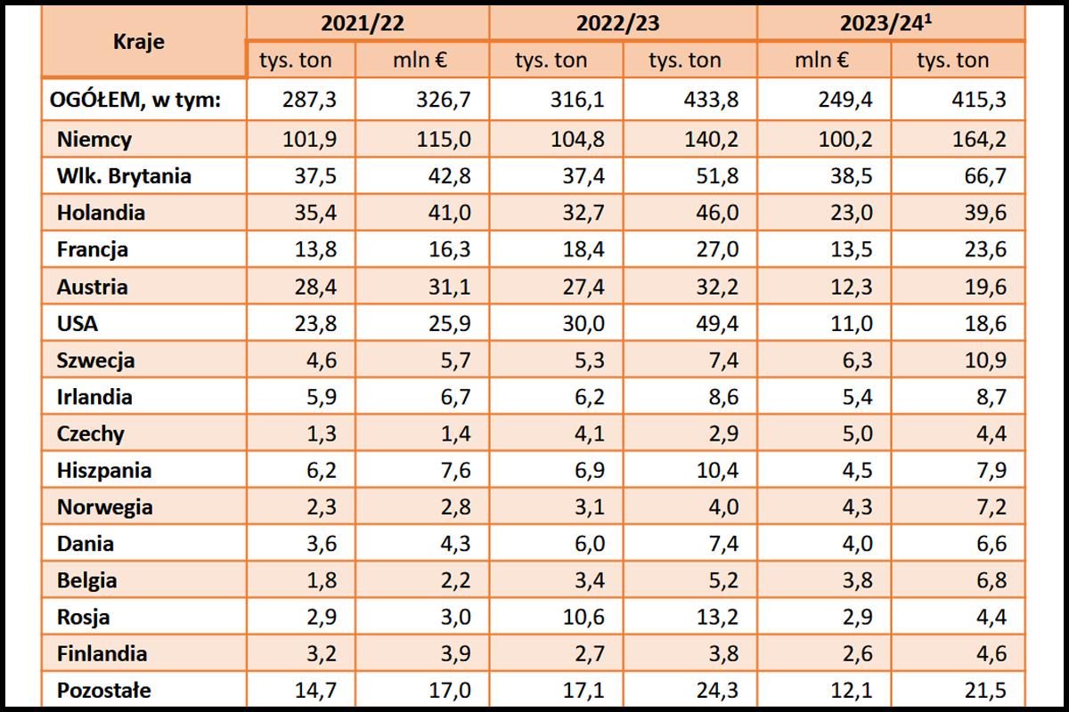 W sumie poza granice polski trafiło 415 tysięcy ton krajowego i reeksportowane produktu. Finalne wyniki za ten sezon zapewne będą niższe z powodu znacznie niższych zbiorów. Widać to doskonale już w danych za wrzesień i październik 2024.