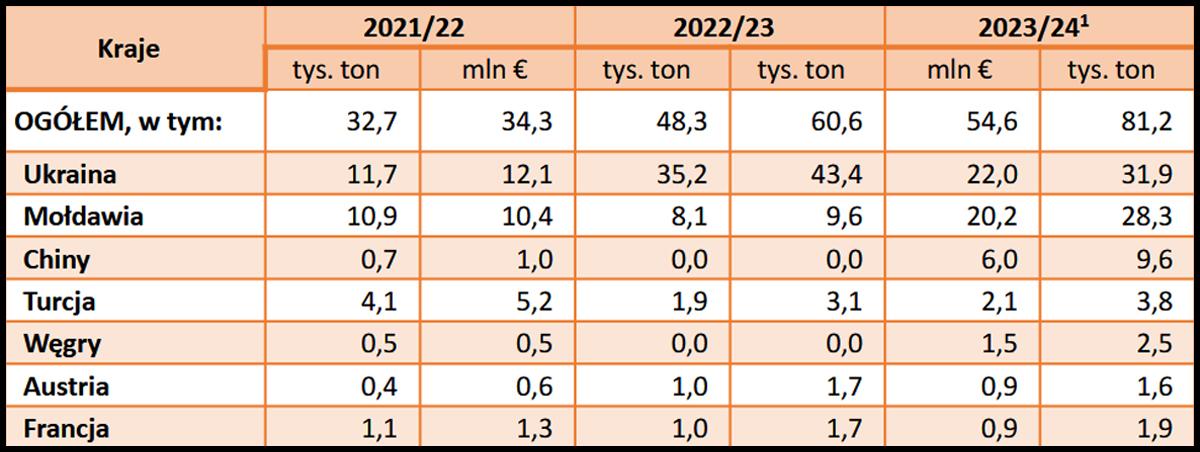 Ponadto autorzy raportu informują, że w sezonie 2023/24 średnie ceny produktu importowanego z Ukrainy wzrosły z 1,23 do 1,45 EUR/kg, a z Mołdawii z 1,18 do 1,40 EUR/kg. W tym sezonie notujemy kolejne wzrosty. Są one pokłosiem międzynarodowej sytuacji w handlu.