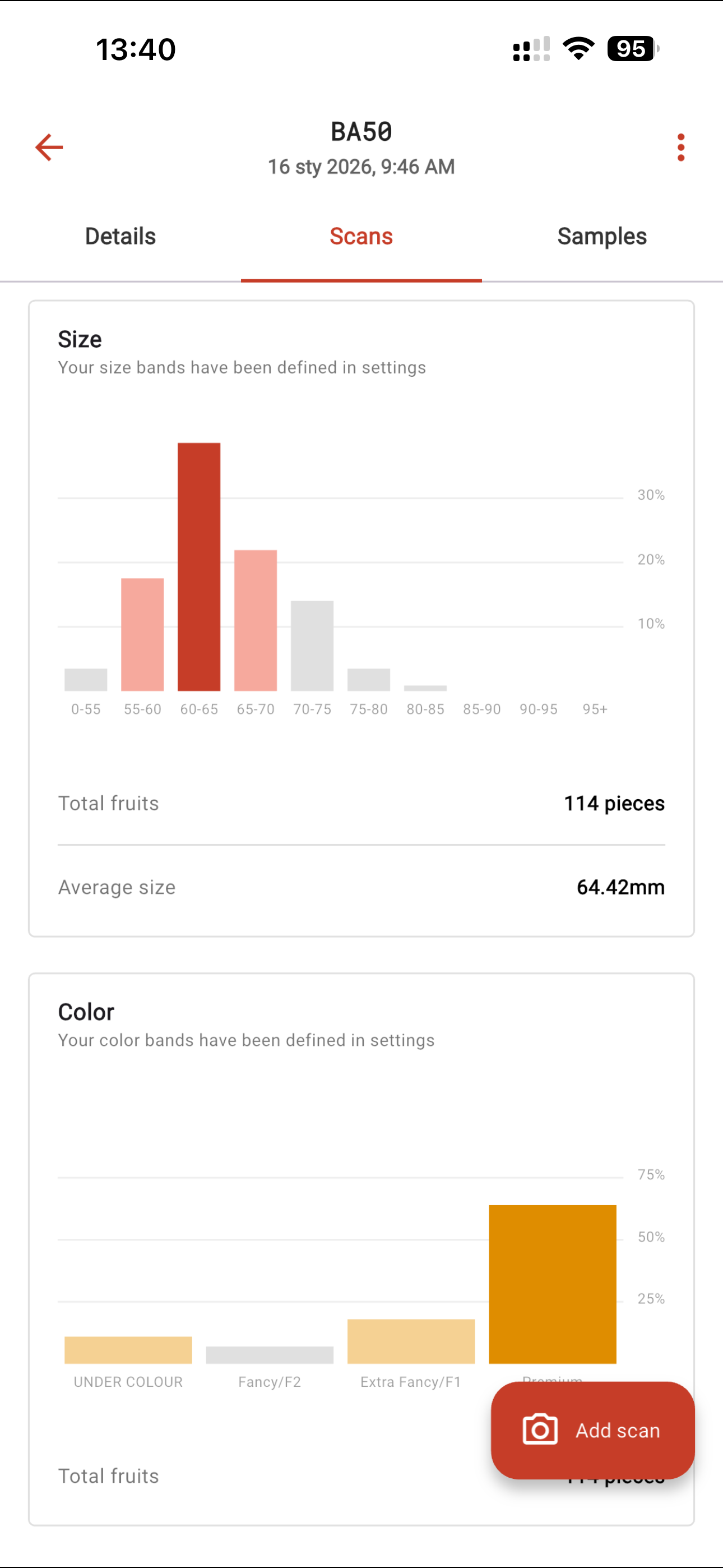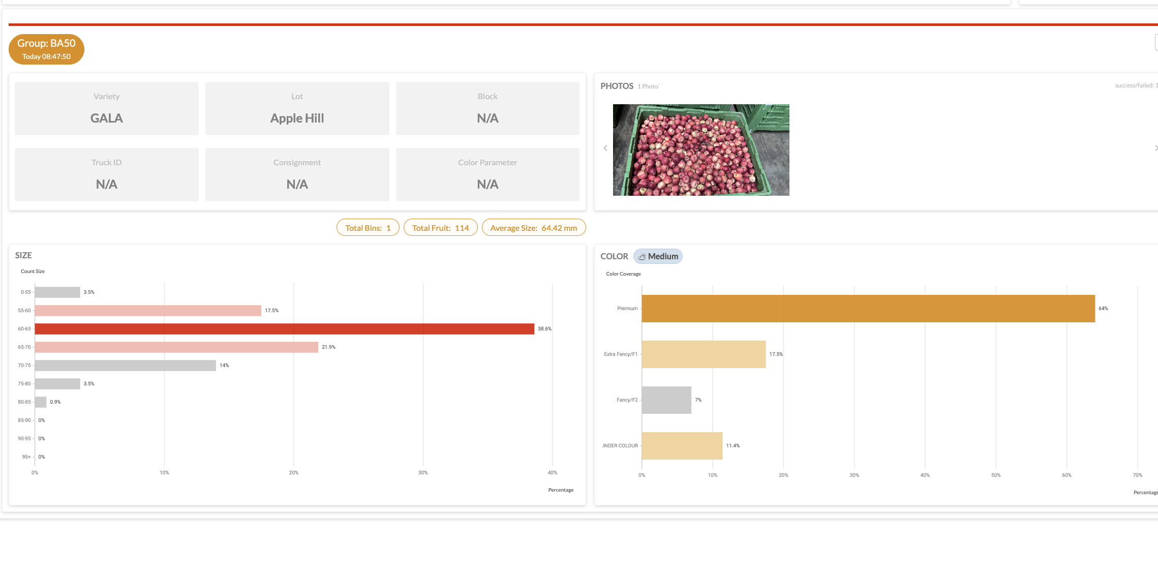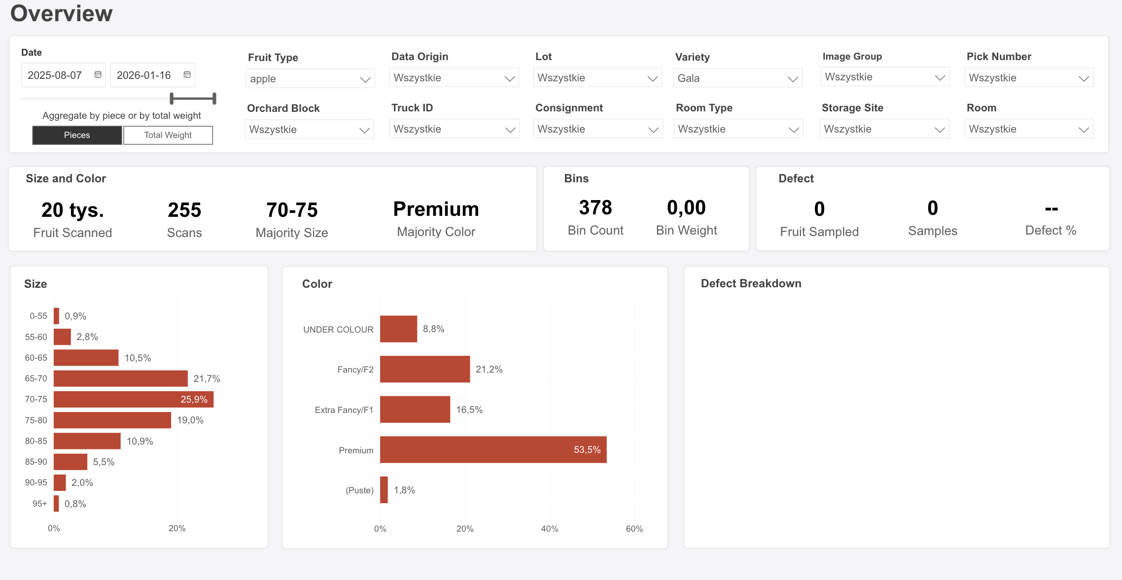 Dla sadownika z własną chłodnią największym problemem jest zwykle to, że po zamknięciu drzwi komór nie widzi dokładnie, co tak naprawdę przechowuje. Wie, że ma np. 300 ton jabłek danej odmiany, ale nie ma pewności, jaki jest rozkład rozmiarów i wybarwienia owoców, jak wyglądają poszczególne partie i które komory warto otworzyć w pierwszej kolejności. Hectre pozwala to uporządkować. Sadownik w czasie zbiorów wstawia kolejne skrzynie do chłodni, robi zdjęcia, a aplikacja zapisuje wyniki i łączy je z daną komorą. Po zakończeniu zbiorów wszystkie dane są w telefonie. Wystarczy wybrać chłodnię i zobaczyć, jak wygląda partia: jakie są dominujące kalibry, jaki procent jabłek ma odpowiednie wybarwienie, jak oceniana jest jakość.