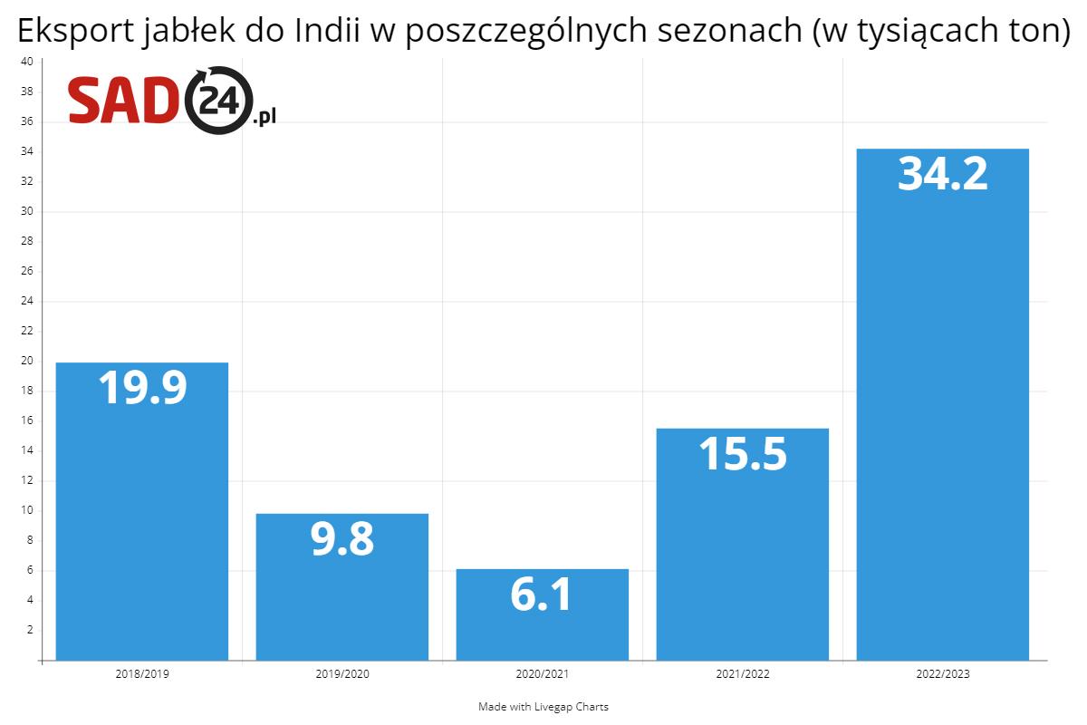 Sezon 2023/2023 zakończył się dużym sukcesem eksportowym to Indii. Do 2014 roku eksport w tym kierunku praktycznie nie istniał. Z kolei w tym sezonie ustanowiliśmy rekord wysyłek do Indii, który wyniósł ponad 34 000 ton. Jak doskonale wiemy, na rynek indyjski trafia przede wszystkim odmiana Gala, a w drugiej kolejności również sporty odmiany Red Delicious.