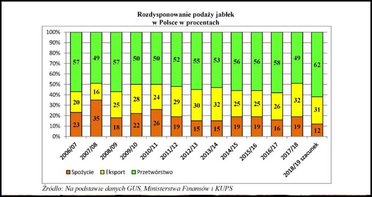 „Zdecydowana większość jabłek produkowanych w Polsce trafia do przetwórstwa przemysłowego. Zgodnie z szacunkami GUS, Ministerstwa Finansów i KUPS w sezonie 2022/2023 do przemysłu rozdysponowanych zostało 71% jabłek. Na eksport trafiło 17% produkcji, a do spożycia 11%” - czytamy w tegorocznym raporcie Polskiego Funduszu Rozwoju.
