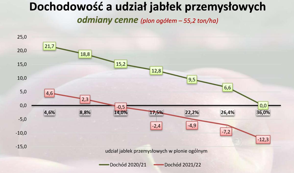 Dr Dariusz Paszko potwierdził tę tezę wynikami swoich wyliczeń. Im mniejszy procentowy udział "przemysłu" tym większa rentowność. Wyliczenia zostały oparte na przykładowym sadzie i plonowaniu na poziomie 55,2 tony. Według obliczeń doktora Paszko zejście poniżej 9% udziału jabłek przemysłowych skutkuje zyskiem nawet w tak trudnym sezonie jak ten. Chodzi o odmiany cenne, czyli Galę, Goldena i Red Deliciousa.