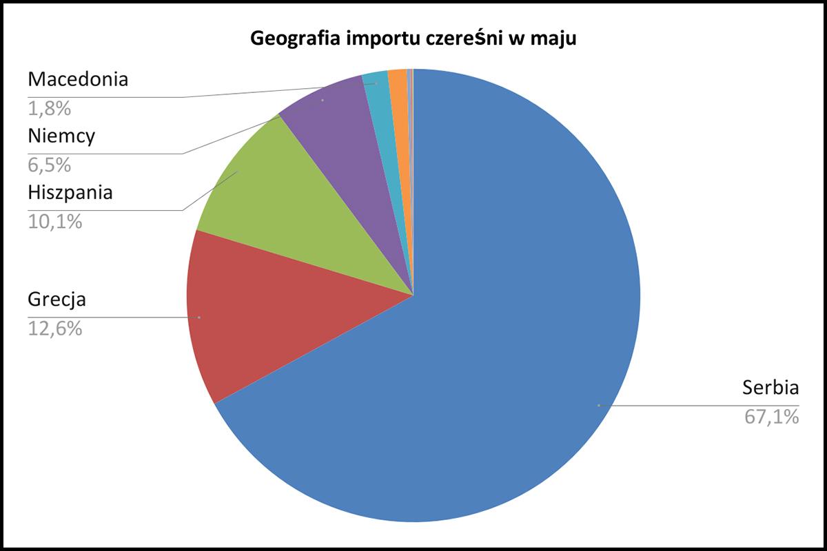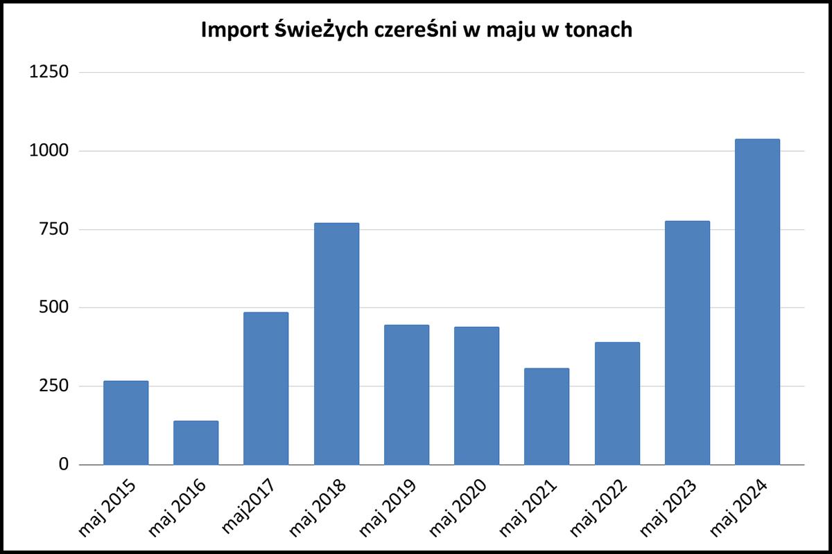 Na poniższym wykresie widzimy, że import świeżych czereśni w maju tego roku był największy od 2004 roku, czyli od momentu, gdy GUS zbiera szczegółowe dane o handlu międzynarodowym. Po raz pierwszy w historii w maju sprowadziliśmy ponad 1000 ton świeżych czereśni. Być może ktoś powie, że to niedużo w skali naszej produkcji. To prawda, jednak omawiana ilość doprowadziła do skumulowanej podaży pod koniec miesiąca. Ponadto stało się to w najbardziej newralgicznym momencie sezonu.