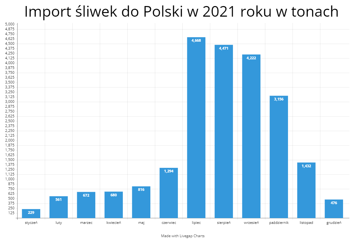 Jak widać na wykresie niżej w 2021 roku zebraliśmy 110 000 ton śliwek, a sumaryczny import wyniósł w całym roku 22 677 ton. Zatem był na poziomie 20,6% zbiorów. Taka wielkość bezsprzecznie miała wpływ na ceny krajowych śliwek, zwłaszcza, że niemal 70% śliwek sprowadzono w lipcu, sierpniu, wrześni i październiku, czyli w okresie, gdy zbieramy te owoce w Polsce.
