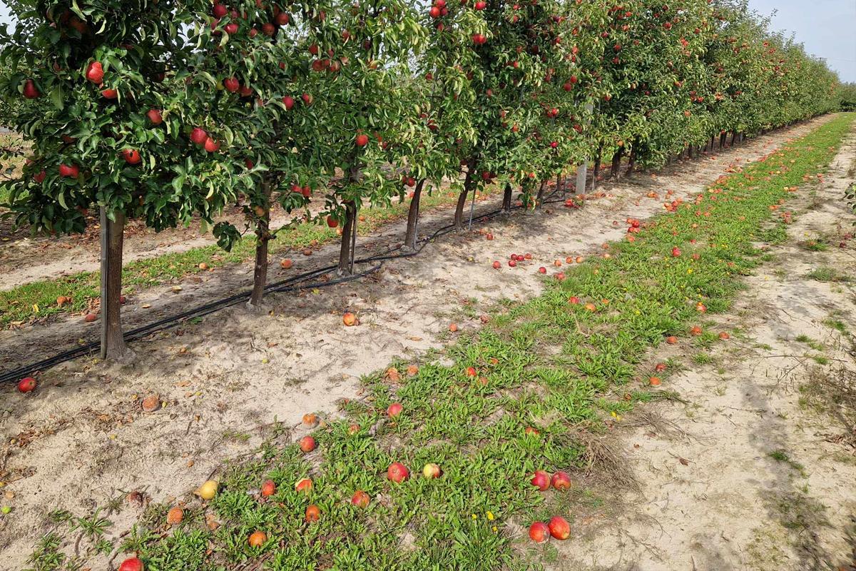 Widok „dywanu” jabłek deserowych pod drzewami w sadzie na wysokim poziomie nie jest dla właściciela niczym przyjemnym.