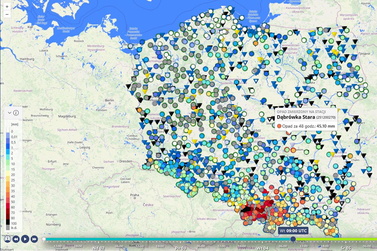 Spójrzmy na sumę opadów z ostatnich 48 godzin. Wyróżnia się na niej przede wszystkim Małopolska z sumami powyżej 50 litrów na każdy metr kwadratowy. Są także mniejsze rejony, gdzie deszcze były niemal równie intensywne. Wśród nich jest część zagłębia grójeckiego. Jak widzimy, stacja IMGW w Dąbrówce Starej (gmina Błędów) naliczyła w ostatnich dwóch dobach opad rzędu 45 litrów na metr kwadratowy.