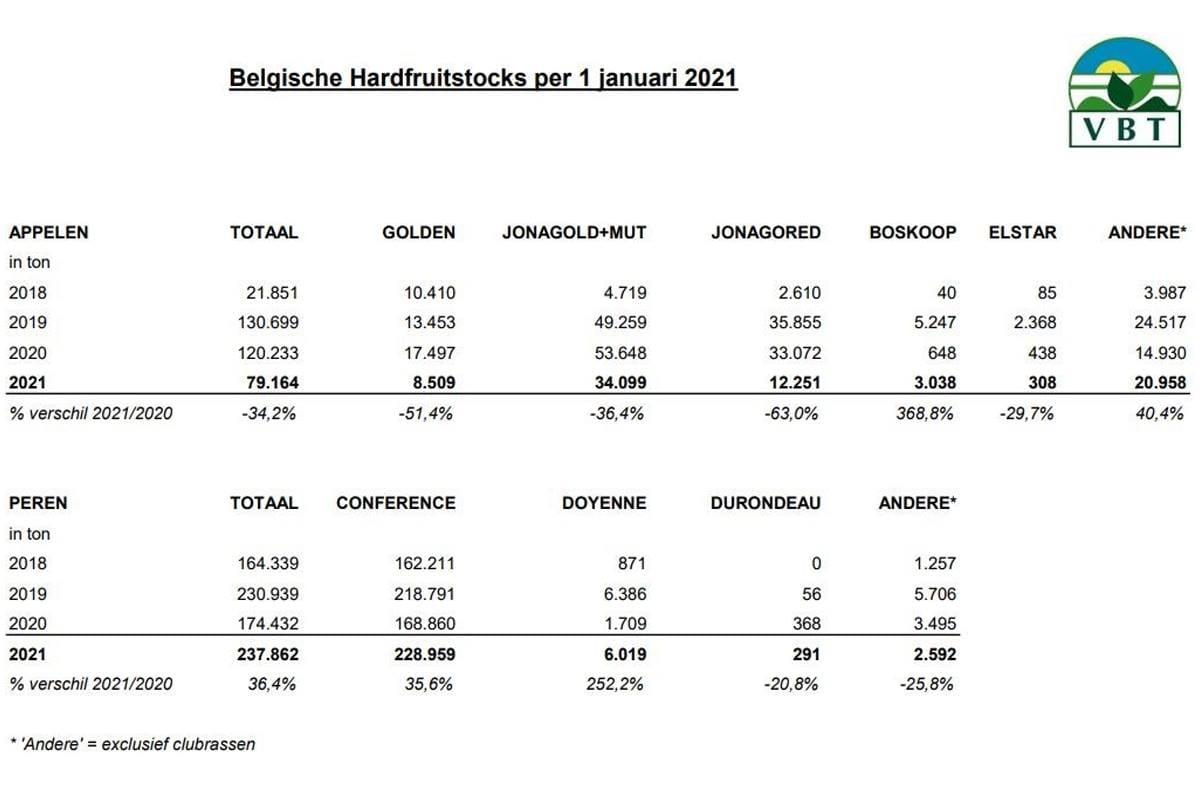 Od pierwszego grudnia do pierwszego stycznia z belgijskich chłodni ubyło 12 000 ton jabłek. Jednocześnie zapasy gruszek są wyższe niż w ubiegłych latach. 1 stycznia 2021 roku były o 36,4% wyższe niż rok temu i wyniosły prawie 238 tys. ton.
