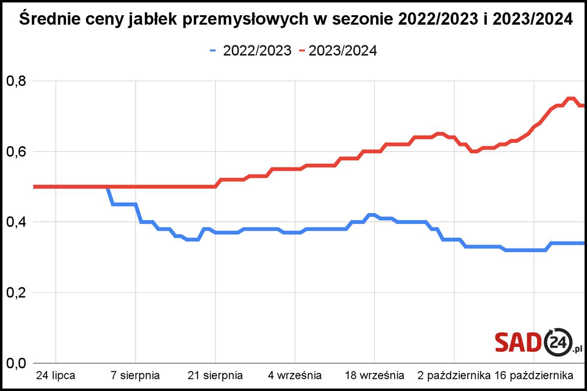 Na wykresie poniżej widzimy, jak kształtowały się ceny w analogicznych okresach trwającego i ubiegłego sezonu. Od początku października notujemy dwukrotność stawek sprzed roku. Sadownicy czekają na kolejne wzrosty, które jeszcze bardziej korzystnie wpłynęłyby na ceny jabłek deserowych.