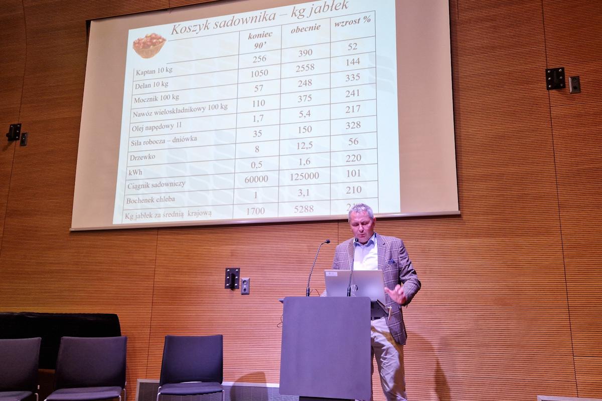 Z kolei dr Tomasz Lipa przedstawił trudną sytuację w polskim sadownictwie. Jako punkt wyjścia do swoich rozważań zaprezentował bardzo ciekawą, autorską tabelę. Pokazał w niej jak zmieniała się siła nabywcza jabłek na przestrzeni 20 lat. Podkreślał również, że sadownicy produkujący owoce najwyższej jakości nadal nie są w stanie uzyskać na polskim rynku odpowiednio wyższych cen za swój produkt.