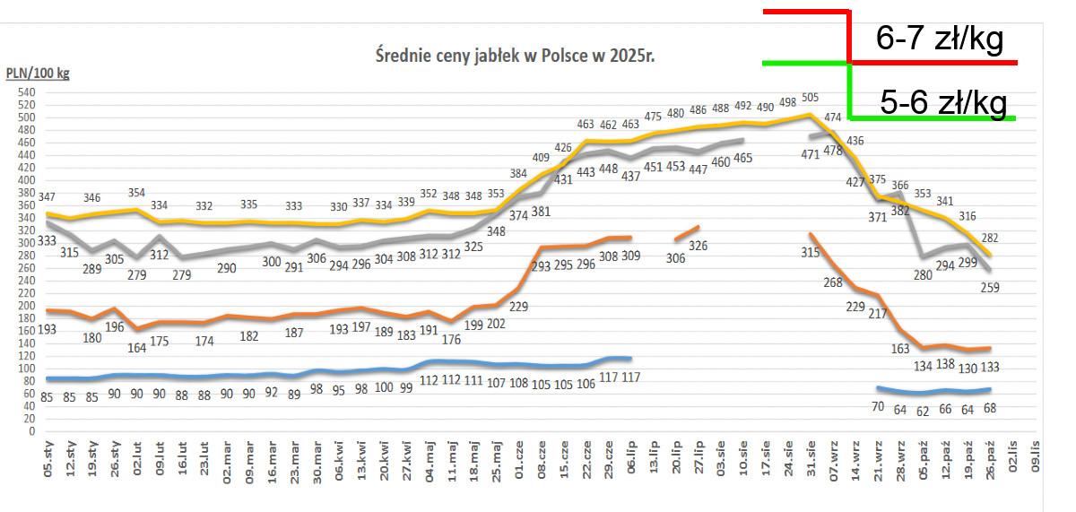Naszym zdaniem przyczyną jest cena, a dokładnie wyższa cena detaliczna jabłek. Przykładowo, w sieci Biedronka większość oferowanych luzem jabłek to dziś 4,99 zł/kg i 5,99 zł/kg. Jeszcze w sierpniu i na początku września na cenówkach widzieliśmy przedział od 6 do 7 zł/kg. Podobne widełki cenowe funkcjonują w innych sieciach. Osoby decyzyjne, kupując coraz taniej, z jakichś powodów nie obniżają cen detalicznych. Zapewne zrobiłyby to, gdyby spadła sprzedaż.